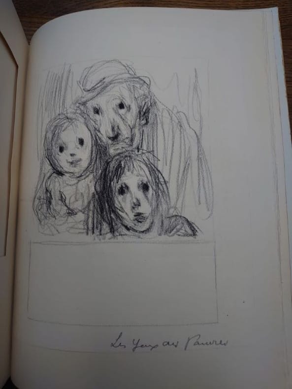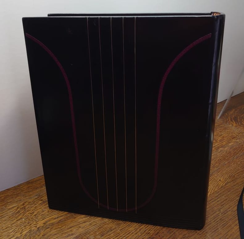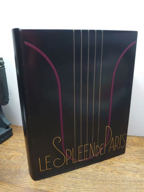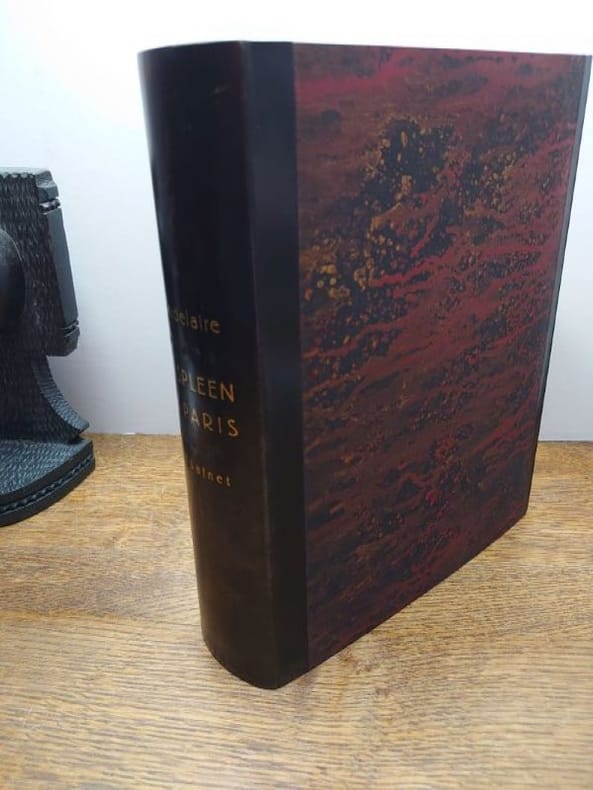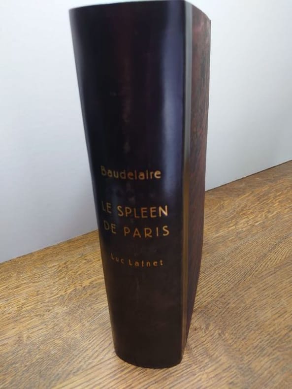 Paris, Les Bibliophiles franco-suisses, 1940. In-4 (29 x 23). Reliure plein veau box noir. Riche reliure signée Georges Cretté : Plats et dos ornés de filets dorés et à froid au travers desquels figure une lyre de maroquin rouge mosaïqué, titre doré au bas sur toute la largeur, dos lisse, filets dorés aux châsses, contreplats et gardes de soie tabis prune, tranches dorées, couvertures et dos conservés, chemise titrée de box noir et emboîtage. Chemise légèrement usée (voir photo), dos de la chemise légèrement passée, et emboîtage avec de légères traces de frottements. Reliure reproduite au catalogue de loeuvre de Georges Cretté (n°41). Illustré de 89 eaux-fortes de Luc Lafnet, Le Spleen de Paris fut son dernier livre dont il ne verra pas la publication. Cet exemplaires est enrichi de 35 dessins originaux titrés par lartiste. Tirage unique à 106 exemplaires sur vélin teinté de Lana. Exemplaire nominatif dAlbert Malle, bibliophile et père du cinéaste Louis Malle. Enrichi dune lettre tapuscrite, signée, reliée à la suite à len-tête des Bibliophiles franco-suisses datée du 9 mai 1941, faisant part des difficultés de publication de louvrage et proposant 20 lots de 4 à 5 dessins originaux à 800 francs.