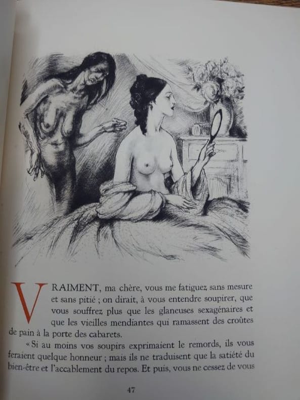 Edition posthume des illustrations de Luc Lafnet (1899-1939), ce baudelairien dans l'âme, artiste peintre et dessinateur de bandes dessinées, d'origine belge, vécut à Paris entre 1923 et 1939. Lafnet "fut remarqué pour ses dons d'illustrateur par les critiques qui le comparèrent à Doré, Callot, Goya, Bruegel ou Bosch. Il vécut presque exclusivement de l'illustration de « livres galants »" (Bénézit). Une "édition recherchée et cotée". (Carteret: Livres ill. modernes, IV, p. 66)