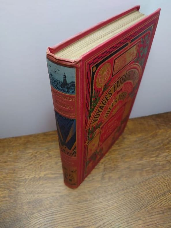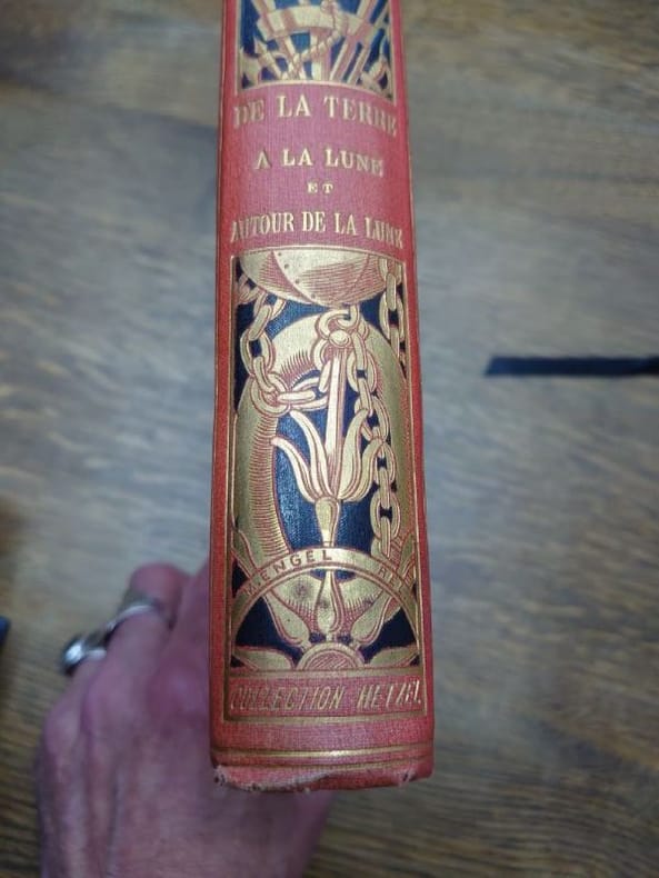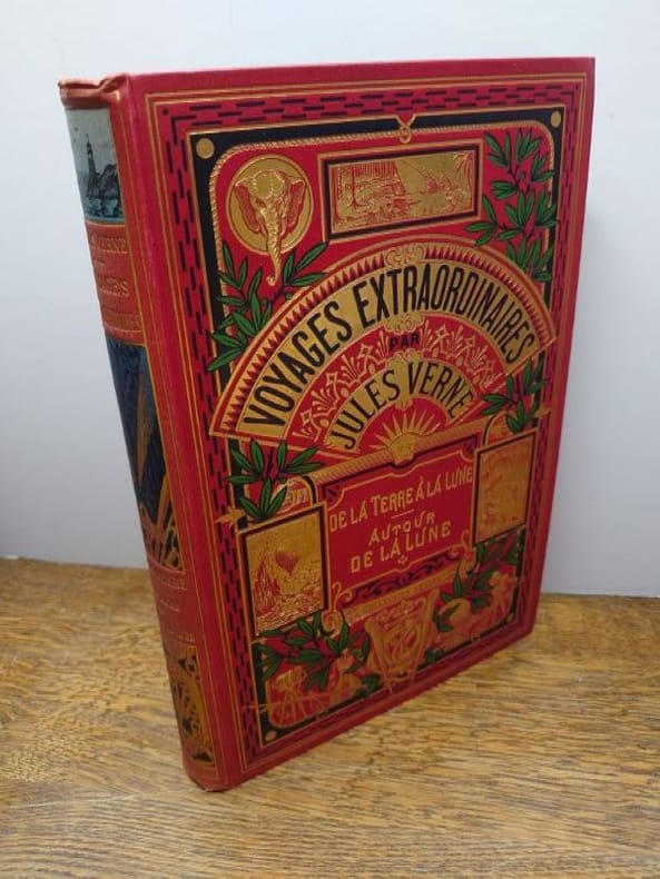 De la terre à la lune, trajet direct en 97 heures et 20 minutes et autour de la lune Collection Hetzel, les Voyages extraordinaires. 41 dessins et une carte par de Montaut, autour de la lune illustré par Emile Bayard et A. de neuville, gravées par Hildibrand. Cartonnage d'éditeur collection Hetzel. vol. in-4, 280x190, bel état intérieur, gravures, tranche de tête dorée, 170, 180pp, très bel état intérieur, tampon du précédent propriétaire. Paris Hachette ss date, 1923
