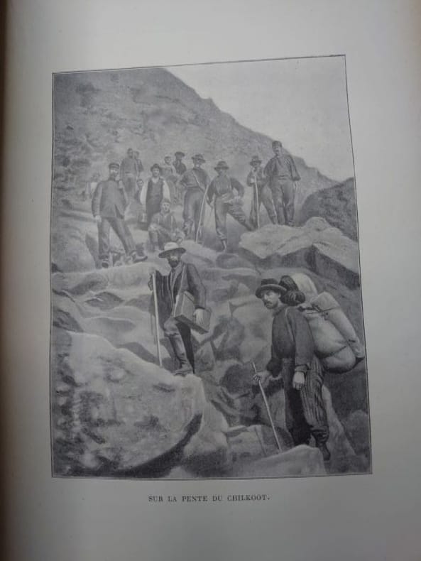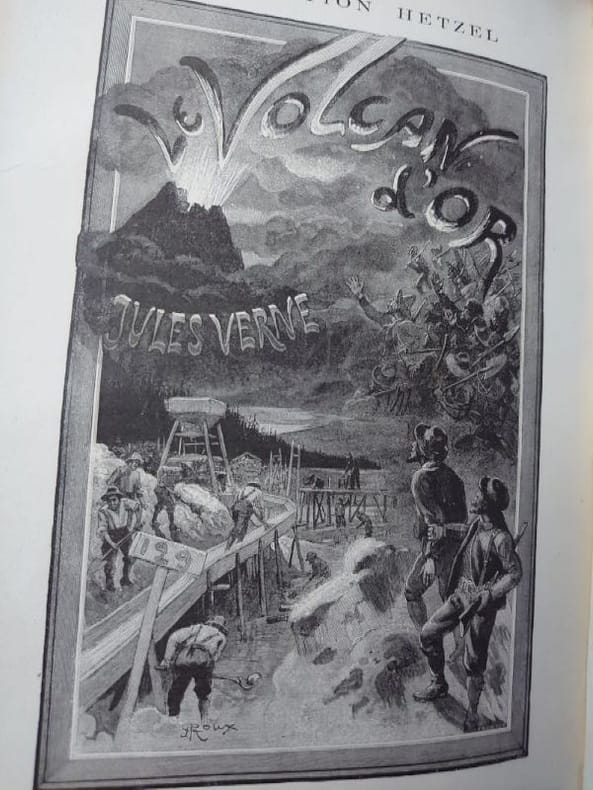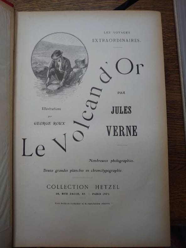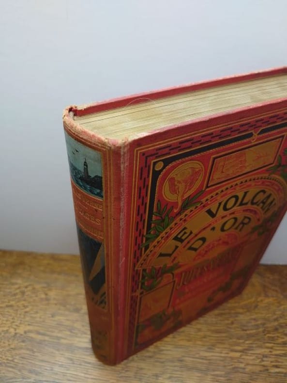 Collection Hetzel, 1906.28 x 18,5 cm, 492 pp. Reliure cartonnage d'éditeur, à l'éléphant, dos au phare, plat historié et doré dans un double encadrement présentant une tête d'éléphant et le titre en éventail, toutes tranches dorées. Relié par Engel. Coiffes affaissées, coins émoussés et cartonnage fané. Avec de nombreuses photographies et 12 grandes planches en chromotypographie. Le Volcan d'Or, écrit en 1899 ne parait qu'en 1906 à titre posthume (Jules Verne décède en 1905) et met en scène, au Canada sur les rives du Klondike, l'histoire de 2 chercheurs d'or.