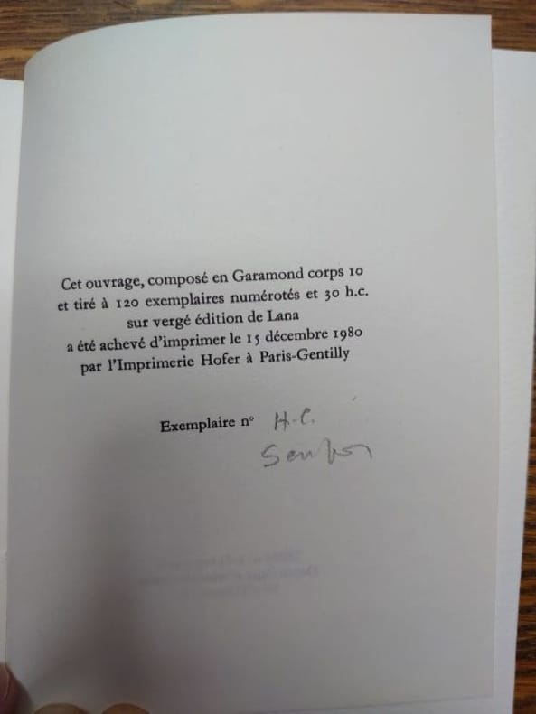 Paris, Jean-Michel Place, 1980 cet ouvrage, compose en Garamond corps 10 et tire a 120 exemplaires numerotet et 30 h.c. sur verge edition de lana. ISBN 2858930422.