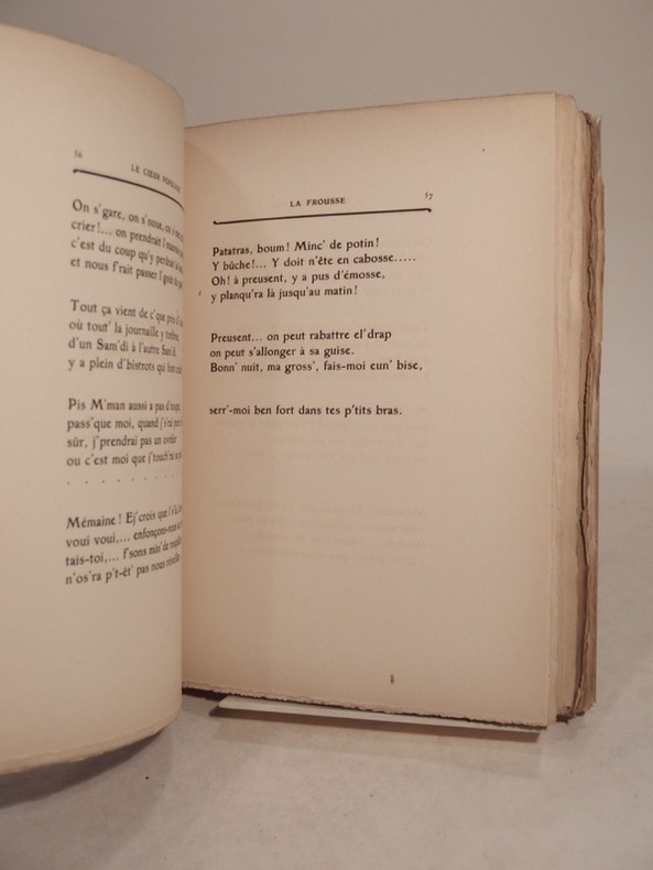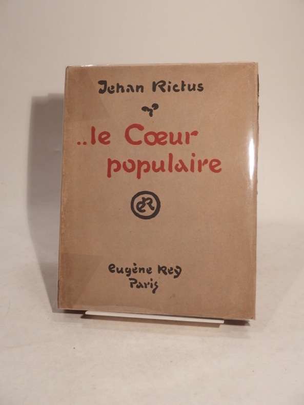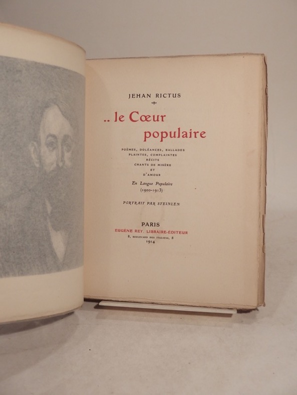Edition originale, illustrée d’un portrait de l’auteur hors texte par Steinlen et comprenant 3 fac-similés de lettres d’Albert Samain et de Stéphane Mallarmé adressées à l’auteur. Tirage total à 1125 exemplaires. 1 des exemplaires numérotés sur vélin d’Arches.Exemplaire enrichi d’importantes pièces :- 1 photographie contrecollée de l’auteur, à table, avec des amis. Une note au crayon au dos précise : Chez Steinlen - sept. 1922.-1 billet contrecollé de Rictus, 17 janvier 1933, adressée à Jacques Bouëssée : « ne lâchez pas, croyez-moi, le Roman ! (…) Vous pouvez prendre tout votre temps pour composer une oeuvre ».-1 lettre montée sur onglet de Georges Lecomte, de l’Académie française, datée du 7 mars 1933. Après avoir mentionné Maurras, il félicite un correspondant, qui lui a rappelé son amitié pour Jehan-Rictus, pour un article intitulé Propos d’un homme. Lecomte souligne qu’il a naguère eu l’occasion d’écrire un article élogieux sur Le Coeur populaire de Jehan-Rictus. L’évolution politique de Lecomte du dreyfusisme aux idées réactionnaires correspond également à celle de Jehan-Rictus qui se rapproche des Camelots du roi vers 1930.- 1 lettre montée sur onglet de Jeanne Landre, actrice montmartroise, vice-présidente de la Société des gens de lettres, 8 janvier 1936. Elle s’oppose à la communication des cahiers du défunt Rictus pour un article sur les personnages importants qu’il a fréquentés (Bloy, Samain). Elle veut protéger son défunt ami contre « les regards indécents » en défendant à tout prix « l’incursion des compilateurs ». Elle avait elle-même publiée en 1930, du vivant de l’auteur, une courte biographie de Rictus sous le titre Soliloques du pauvre Jehan Rictus.-le poème Madrigal manuscrit et signé du nom patronymique de Jehan-Rictus, Gabriel Randon. Relié in-fine le prospectus de parution d’un ouvrage de Lucien Descaves. Barabbas, chez le même éditeur.