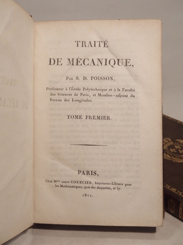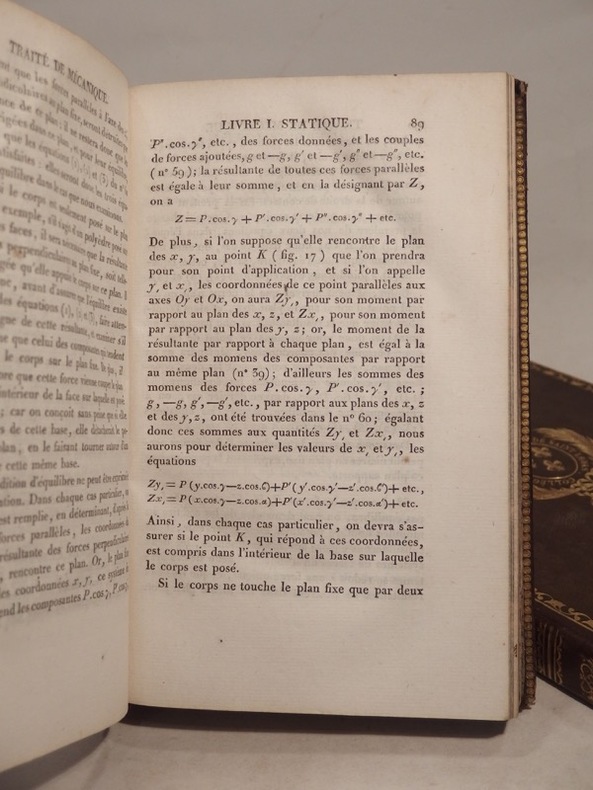 Bien complet de la planche dépliante au tome IV. Édition originale de l'un des ouvrages scientifiques parus les plus importants depuis les "Principia" de Newton. Durant plus d'un siècle il a été la bible de tous les astronomes, et encore aujourd'hui, en dehors des corrections relativistes, les astronomes contemporains utilisent des méthodes qui pour la plupart figurent dans l'ouvrage de Laplace. "Les deux premiers volumes - publiés en 1798 - du "Traité de mécanique céleste" divisé en cinq livres, exposent des rappels de mécanique rationnelle, la loi de la gravitation universelle, la figure des corps célestes, la théorie des marées, les mouvements des corps autours de leur centre de gravité (ainsi que la précession et la nutation). Le troisième volume - 1802 - est divisé en deux livres, le livre VI sur la théorie des mouvements planétaires et le livre VII sur la théorie de la Lune. Le quatrième - 1805 - volume est divisée en trois livres, le livre VIII sur la théorie des satellites de Jupiter, Saturne et Uranus, le livre IX sur les comètes, et le livre X qui traite de la réfraction astronomique et d'autres questions annexes. Le cinquième volume - publié en 1825 - est divisé en six livres essentiellement consacrés à des notices historiques sur des sujets traités dans les quatre premiers volumes, mais y figurent aussi des recherches originales en particuliers sur l'attraction des sphères." En Français dans le texte 201. Bien complet du "Supplément au dixième livre du traité de mécanique céleste. Sur l'action capillaire" et du "Supplément à la théorie de l'action capillaire" avec son propre titre et son faux-titre (1807); mais sans le petit supplément du tome III. Les volumes I et II sont imprimés sur un papier portant, en filigrane, "MECANIQUE CELESTE". Quelques rousseurs, plus prononcées au titre et à la table (uniquement) du volume cinq. Dibner, Heralds of Science, 14. D.S.B., XV, pp. 273-403. Horblit 63. Roberts & Trent, Bibliotheca Mechanica, pp. 197-98. Sparrow, Milestones of Science, 125.