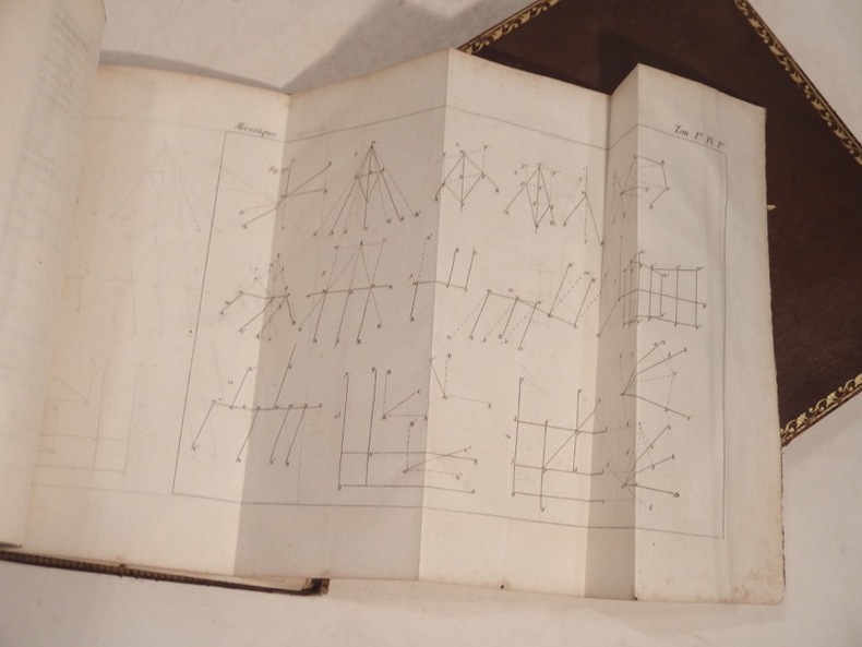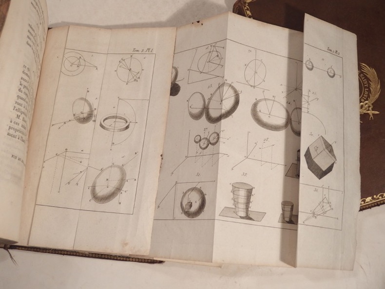 Paris, J.B.M. Duprat; Bachelier, 1798-1805. 4 volumes relié en deux tomes in-4 demi-vélin de XXXII-368; [4]-382 et XXIV-304; 24; 40-347-[1]; [2]-65-[1]; 78-[2] pages, dos lisses, étiquette de titre brune. Reliure XIXe. Collation: vol. 1: a-d4; A-Z4; Aa-Zz4. vol. 2: []2; A-Z4; Aa-Zz4; Aaa4; Bbb3 (le feuillet Bbb4 semble être un feuillet blanc). vol. 3: a-c4; A-Z4; Aa-Pp4. suppl. 1: A-C4. vol. 4: a-e4; A-Z4; Aa-Vv4; Xx2. suppl. 2: []1; AH4; I2 (le second feuillet est la planche dépliante). suppl. 3: A-K4.