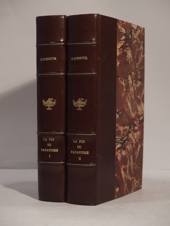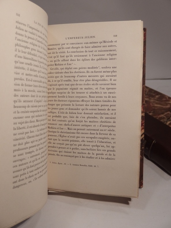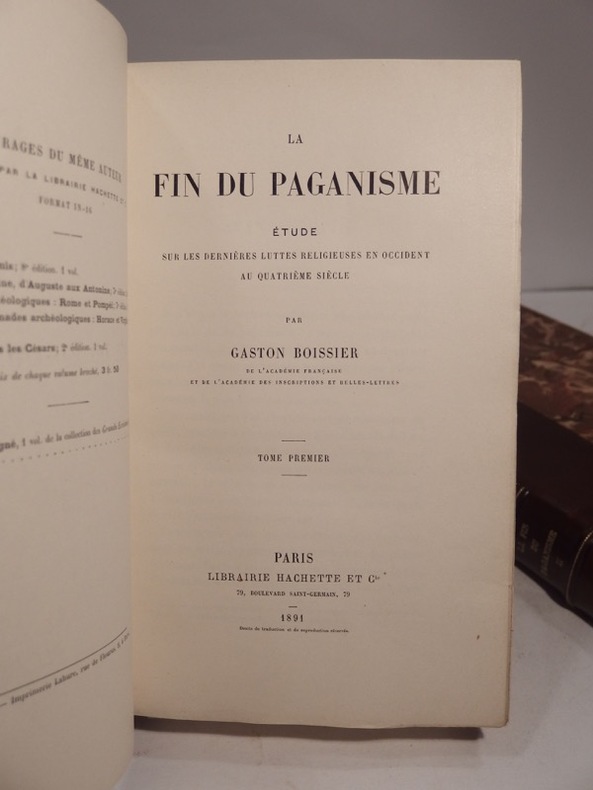 Paris Hachette 1891. In-8 462pp. Demi vélin ivoire à coins, dos lisse, pièces de titre et de tomaison rouges, tête brique, reliure de l'époque. Rousseurs par endroits, petit manque en tête de la pièce de titre, reliure solide et en bon état. TOME I SEUL complet de son texte et des sujets traités (conversion de Constantin, Christianisme et éducation romaine, conséquences de l'éducation païenne sur les auteurs Chrétiens, conversion de Saint Augustin, "Manteau" de Tertullien, fusion des éléments sacrés et profanes. (4569)