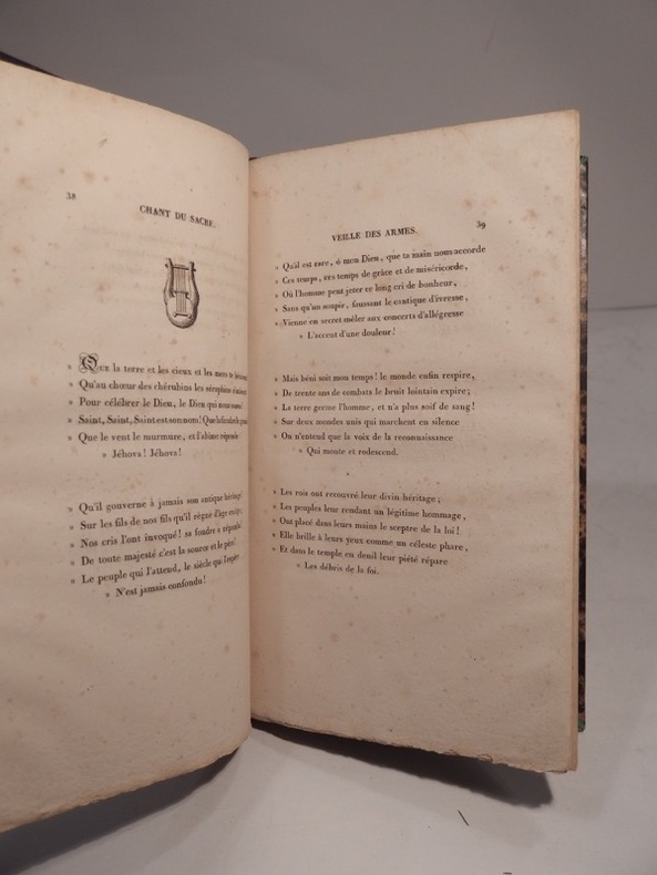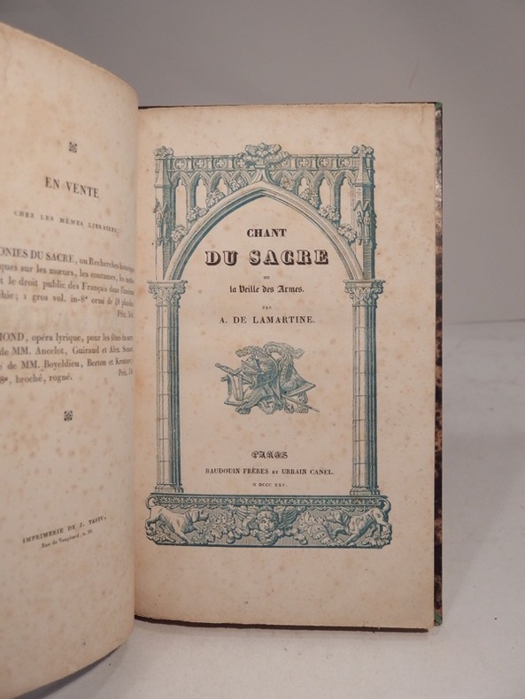Suivi de : Notes pour servir au Chant du Sacre.Édition originale. Paris, Baudouin Frères et Urbain Canel - 1825 - 64 pages.Reliure demi maroquin vert bouteille à larges coins. Dos 4 nerfs aux titre, auteur, Date en pied, et fleuron central, dorés. Filet à froid. Pages de titre illustré. Vignettes dans le texte. Pas de rousseur. Parfait état. Bel exemplaire, bien relié. Format in-8°(22x14).
