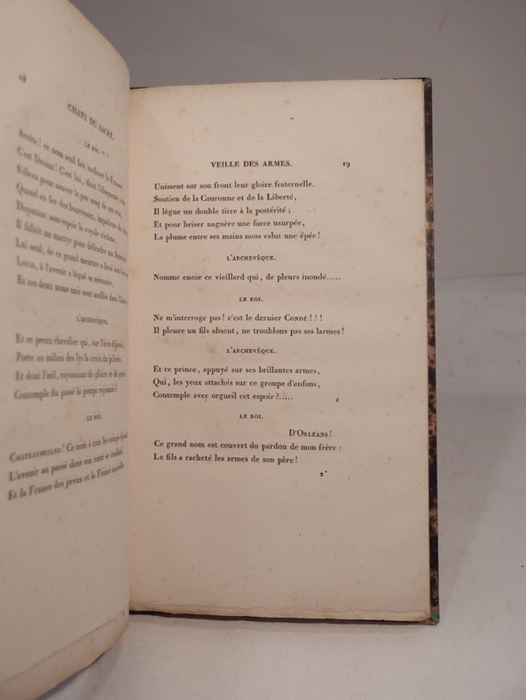 Premier tirage, contenant bien au bas de la page 19 : "D'Orléans! Ce grand nom est couvert du pardon de mon frère : le fils a racheté les armes de son père!" Ces quelques vers déplurent au Duc d'Orléans, qui furent expurgés par Lamartine lors du second tirage,exemplaire a grandes marges,la page 5 est reparée sans manque,rousseurs eparses,manques aux coiffes et bas dos Remise de 20% pour toutes commandes égales ou supérieures à 200 €