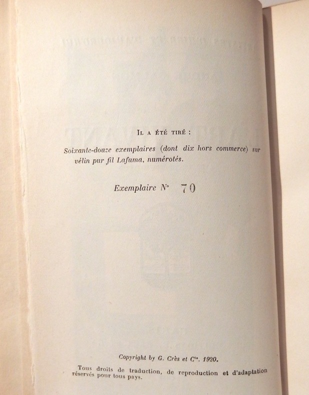 Edition originale, un des 72 sur vélin. * Voir photographie(s) / See the picture(s). * Membre du SLAM et de la LILA / ILAB Member. La librairie est ouverte du lundi au vendredi de 14h à 19h. Merci de nous prévenir avant de passer,certains de nos livres étant entreposés dans une réserve.
