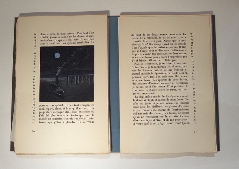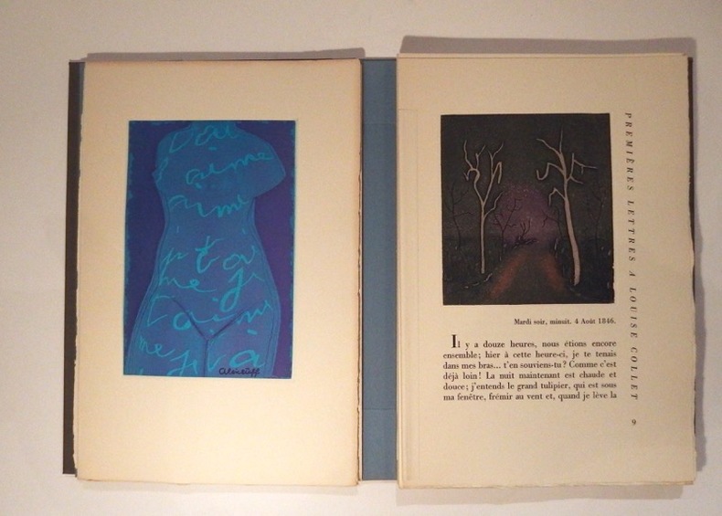 Paris Les Impénitents 1957 In-4, en feuilles, couverture imprimée (emboîtage de l'éditeur).Cette édition des huit premières lettres adressées par Flaubert à sa "muse" Louise Colet, est illustrée d'un frontispice gravé sur cuivre par Alexandre Alexeïeff, et de 13 eaux-fortes originales en couleurs de J.J.J. Rigal. Tirage limité à 145 exemplaires numérotés sur vélin de Rives. Un des 25 premiers exemplaires, seuls à comporter une estampe originale supplémentaire justifiée et signée par J.J.J. Rigal, et une suite à part des 13 eaux-fortes sur japon. Exemplaire enrichi sur le faux titre d'un dessin original au crayon, avec envoi, signé par J.J.J. Rigal, d'une des 10 suites en premier état des illustrations sur chine appliqué, d'une des 10 suites sur vélin de quatre états successifs de la gravure de la page 33, du cuivre original ayant servi à l'impression de cette gravure, d'une des 10 épreuves signées d'une des illustrations imprimée en couleurs avec des variantes sur japon nacré, et d'une gouache originale en couleurs signée par J.J.J. Rigal (variante de l'illustration de la page 67).