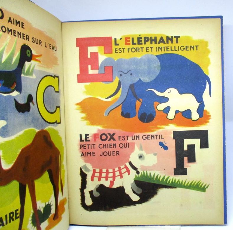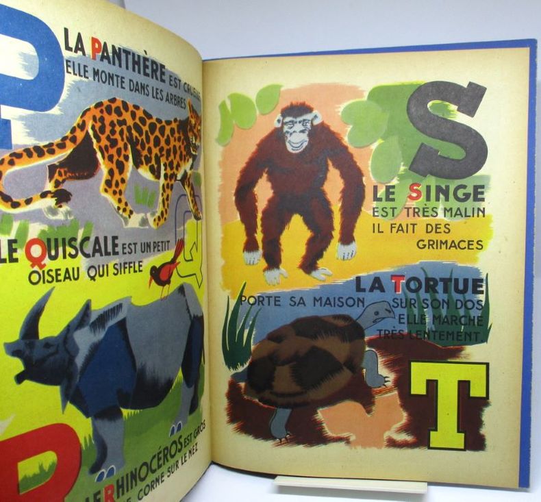 5 ff. n. ch., figures en vert et 23 compositions en couleurs. Très agréable alphabet combinant iconographie animalière en couleurs, et méthode syllabique simple pour l'apprentissage de la lecture
