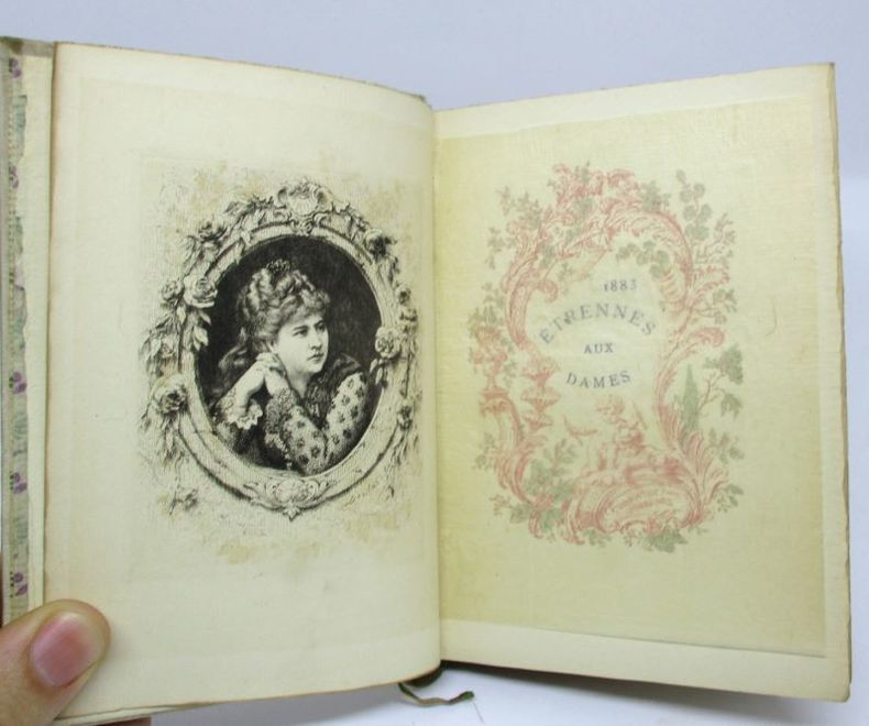 CL Motteroz, Calendrier des dames françaises pour l'an de grâce 1883, in/16, reliure éditeur, plat illustré sur de la soie, dos restauré, 128 pages. Belle publication, gravure en frontispice et une gravure de Boulard fils, avec des texte de Frédéric Bazin, Victor Hugo, Théophile Gautier, Maurice Tourneux, Robert de Bonnières, Ernest D'Hervilly, Julia Daudet, Armand Silvestre, H. Gréville, Philippe Gille, Anatole France, Étincelle, Octave Lacroix, Edmond de Goncourt, Louis Rastibonne, Juliette Lamber, Gilbert-Augustin Thierry, Henry Roujon, Léon Barracand. Tirage 300 exemplaires, sur Hollande N° 291.