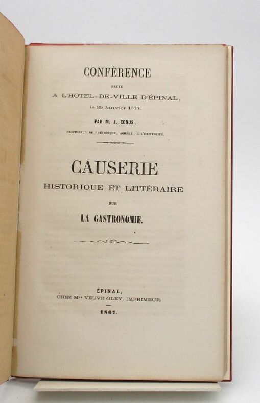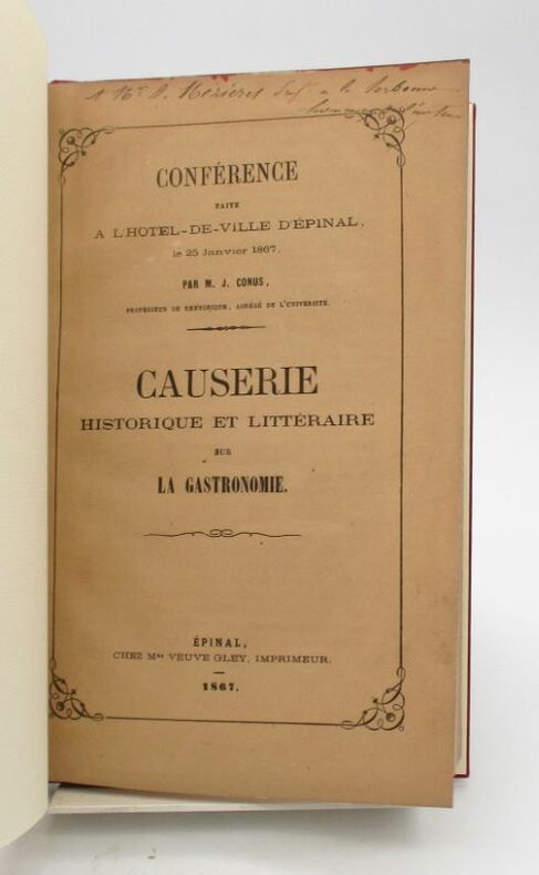 Tirage à part de la conférence faite à l'Hôtel-de-ville d'Épinal, le 25 janvier 1867, extraits des Annales de la société d'émulation des Vosges sur l'histoire de la cuisine. Voir photographie(s) / See picture(s) * Membre du SLAM et de la LILA / ILAB Member. La librairie est ouverte du lundi au vendredi de 14h à 19h. Merci de nous prévenir avant de passer,certains de nos livres étant entreposés dans une réserve.