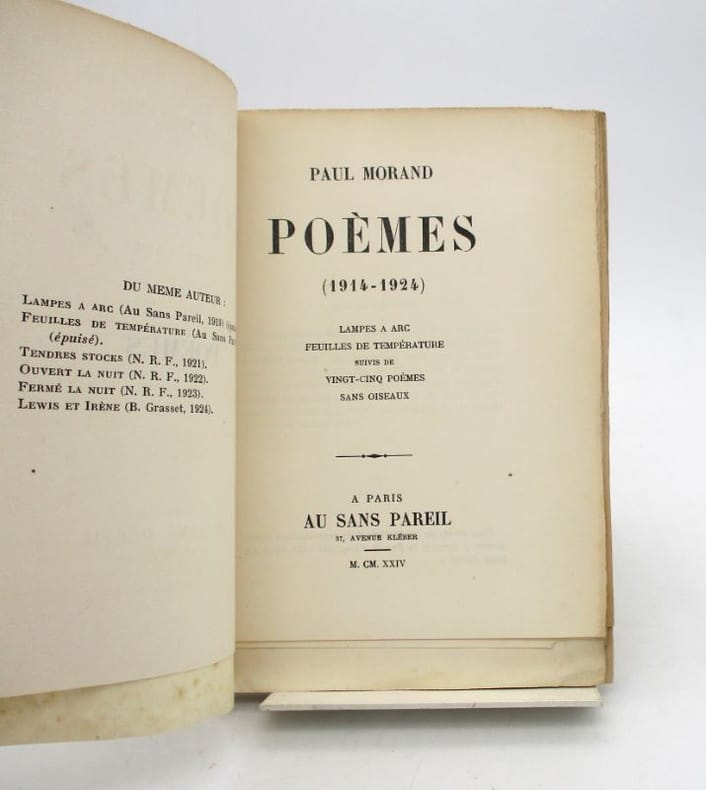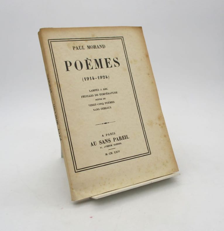 1924. Au Sans Pareil. 1924. 136 pp. In-8. Broché. Très bon état. 1 volume. PREMIÈRE ÉDITION EN PARTIE ORIGINALE. Celui-ci un des 800 exemplaires numérotés sur vélin Lafuma de Voiron. Avec les deux premiers recueils de poèmes de Morand, « Lampes à arc » et « Feuilles de température » alors épuisés, tandis que Les « Vingt-cinq poèmes sans oiseaux » paraissent ici pour la première fois.