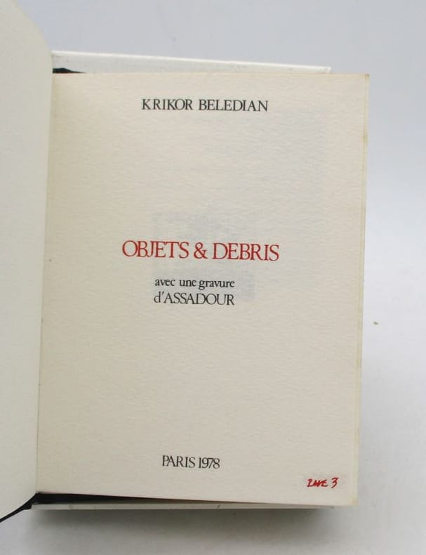 Tirage limité à 200 exemplaires. Né à Beyrouth en 1945, Krikor BELEDIAN a fait des études de philosophie et vit à Paris depuis 1967. Il publie des textes et chroniques sur des lieux ravagés par les conflits, création poétique et artistique métaphore de la destruction. "Débris et objets" a été écrit en marge d'une exposition d'ASSADOUR à la galerie Sagot Le Garrec en 1977. Le texte, en vertu des origines communes, est imprimé en français et en arménien. Les gravures ont été tirées en taille-douce.