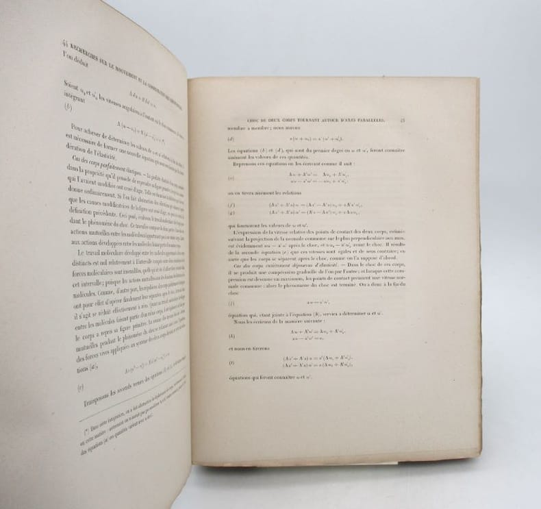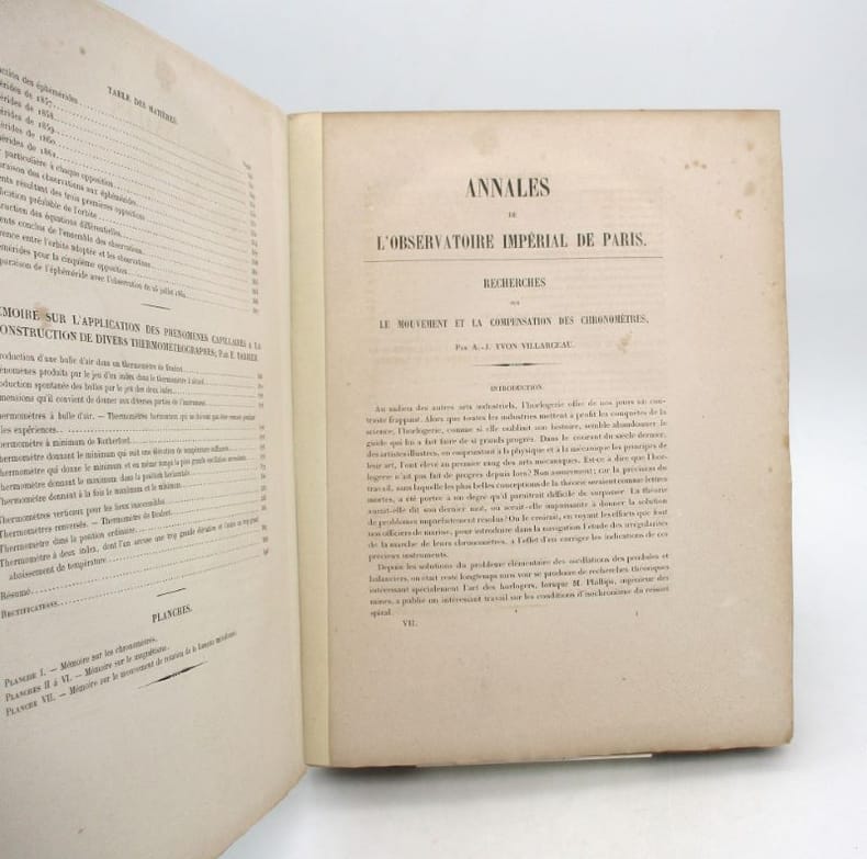 Édition originale du tome VII des mémoires de l'Observatoire de Paris. Elle comprend les Recherches sur le mouvement et la compensation des chronomètres d'Yvon Villarceau, le Mémoire sur les inégalités à longues périodes du mouvement des planètes de Puiseux, les Recherches magnétiques de Desains et Charault, le Mémoire sur le calcul des divers termes du mouvement de la fonction perturbatrice et de ses dérivés de Bourget, l'Étude sur le mouvement de rotation de la lunette méridienne d'Yvon Villarceau, la Détermination de l'orbite de la planète Eugènie de Loevy [sic : LoevyLoewy] et le Mémoire sur l'application des phénomènes capillaires à la construction de divers thermométrographes de Barbier. Elle est illustrée de 7 planches gravées. * Membre du SLAM et de la LILA / ILAB Member. La librairie est ouverte du lundi au vendredi de 14h à 19h. Merci de nous prévenir avant de passer,certains de nos livres étant entreposés dans une réserve.
