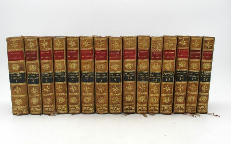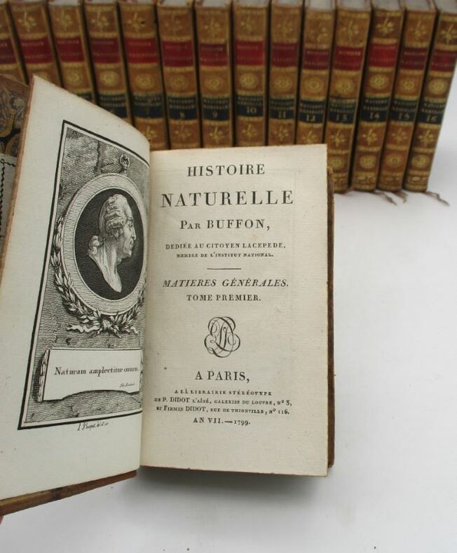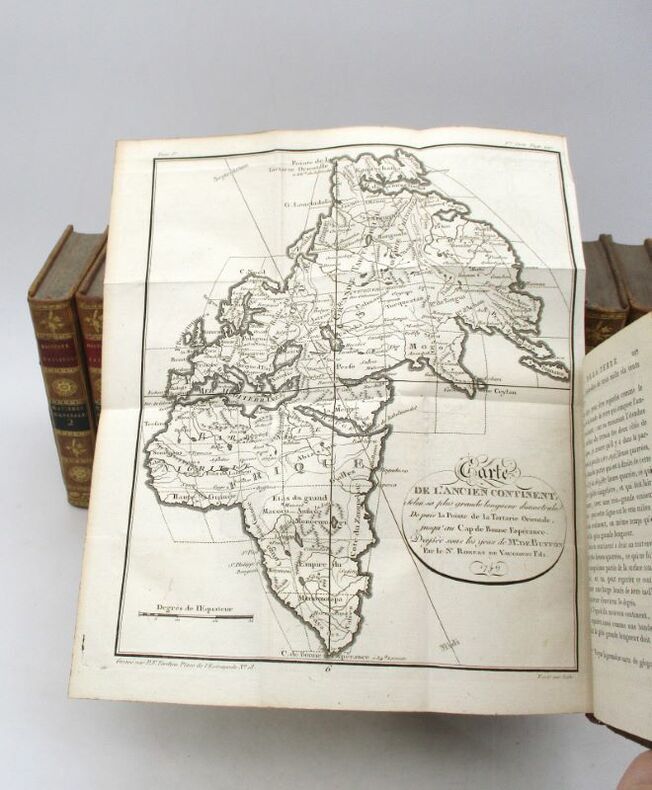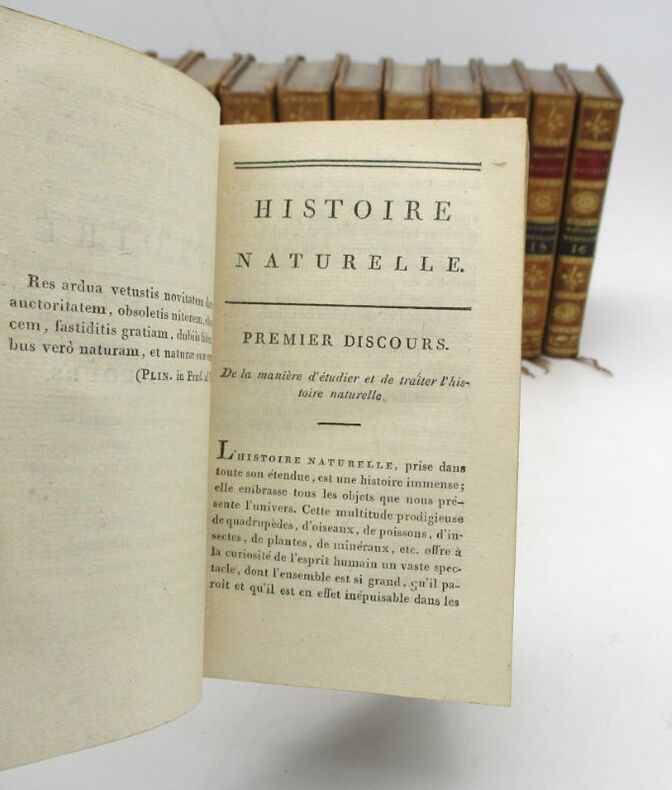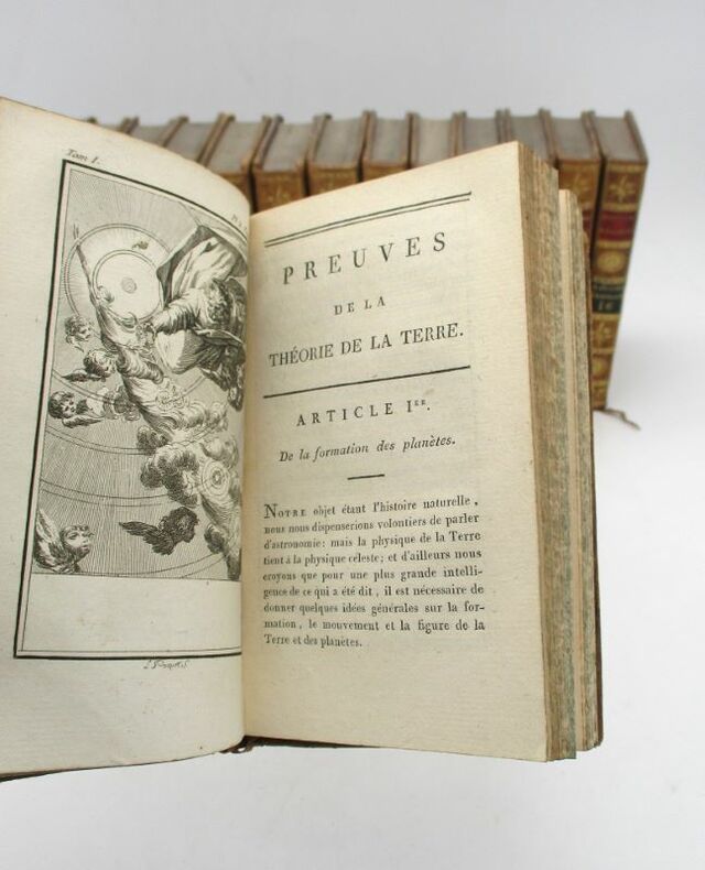 Jolie petite édition illustrée de la série Matières générales de l'Histoire naturelle de Buffon. Elle est illustrée d'un frontispice de l'auteur par Pauquet , de 4 cartes dépliantes (dont 2 gravées par Tardieu) et de 33 planches hors texte (une même planche peut comporter plusieurs figures qui sont numérotées comme une planche à part), gravées par Gaitté et Pauquet. Nous possédons, dans la même reliure, toutes les séries composant l'Histoire naturelle. Bon état intérieur, jolie reliure. Étiquette Ant.e Ruelle, payeur du Trésor royal. * Membre du SLAM et de la LILA / ILAB Member. La librairie est ouverte du lundi au vendredi de 14h à 19h. Merci de nous prévenir avant de passer,certains de nos livres étant entreposés dans une réserve.
