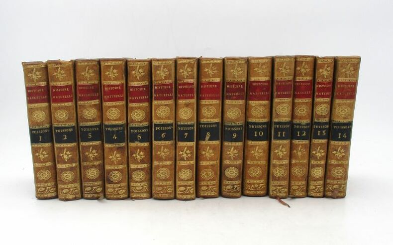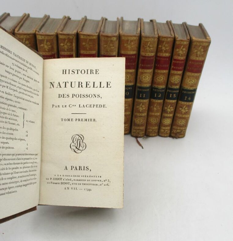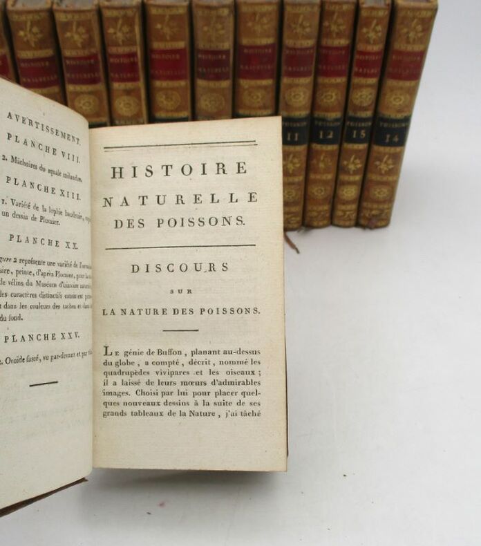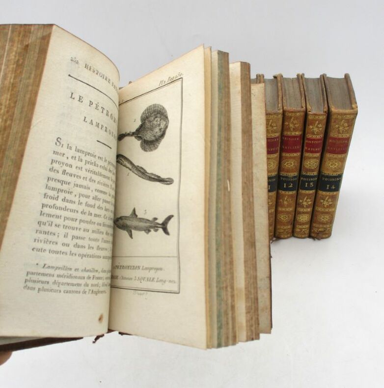 Jolie petite édition illustrée de la série des Poissons de l'Histoire naturelle. Elle est illustrée de 116 planches hors texte gravées par Pauquet. Nous possédons, dans la même reliure, toutes les séries composant l'Histoire naturelle. Bon état intérieur, jolie reliure. Étiquette Ant.e Ruelle, payeur du Trésor royal. * Membre du SLAM et de la LILA / ILAB Member. La librairie est ouverte du lundi au vendredi de 14h à 19h. Merci de nous prévenir avant de passer,certains de nos livres étant entreposés dans une réserve.