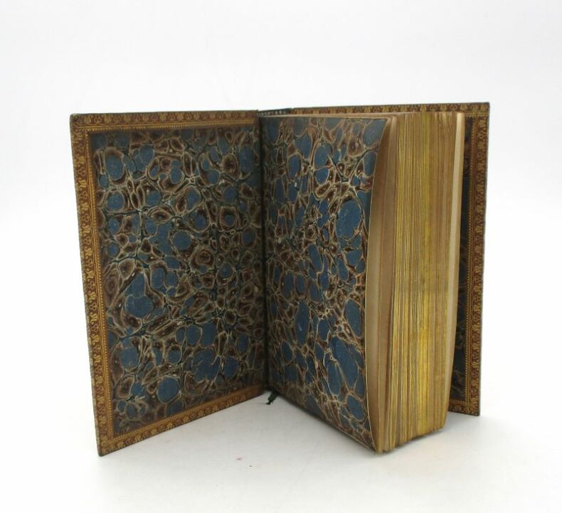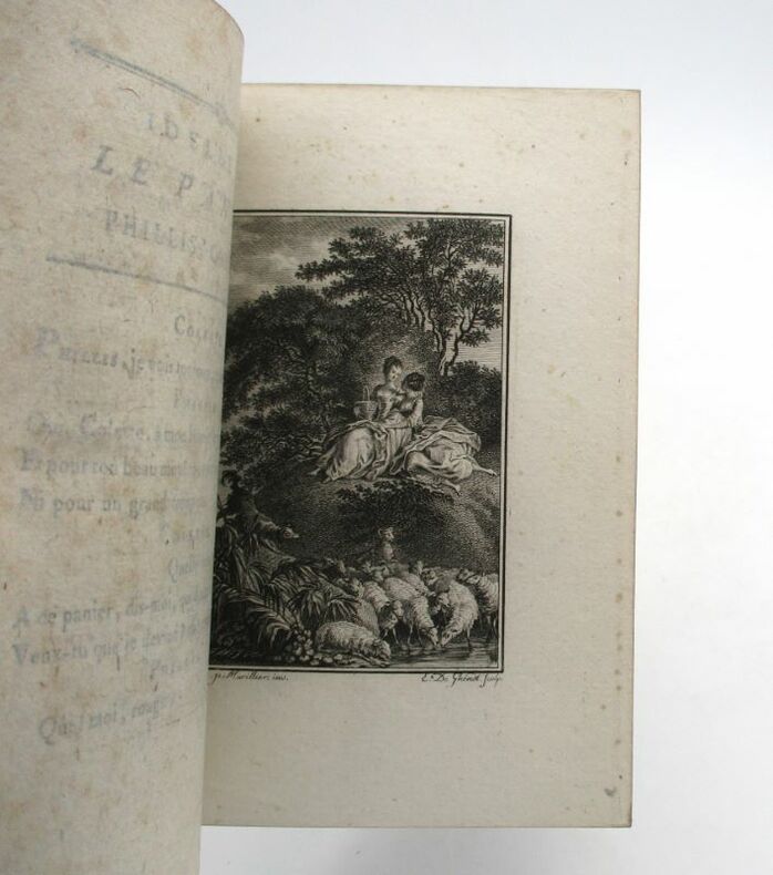 1775 A Paris, chez Ruault, 1775. Deux volumes petit in-8° (112 x 146 mm) de VI+53+[1bl] / 70+[1]+[1bl] pages. Lornementation des volumes comprend: 1 titre-frontispice dessiné et gravé par Marillier, et 24 figures numérotées avec le texte «dune grâce ravissante» (Cohen) 12 par volume du même, gravées par Gaucher, De Ghendt, Le Gouaz, Delaunay, Lebeau, Masquelier, Née et Ponce, dont 4 sont datées de 1774 au volume I, et 4 de 1775 au volume II. Belles reliures de lépoque en plein veau fauve marbré de couleurs, triple filet doré sur les plats, roulette dorée sur les coupes, dos lisses ornés, étiquettes de titre en maroquin rouge, tranches dorées. La collation de notre exemplaire a priori une première édition ne correspond toutefois pas à celle de Cohen De Ricci, 139, qui indiquent respectivement 55 et 67 pages.
