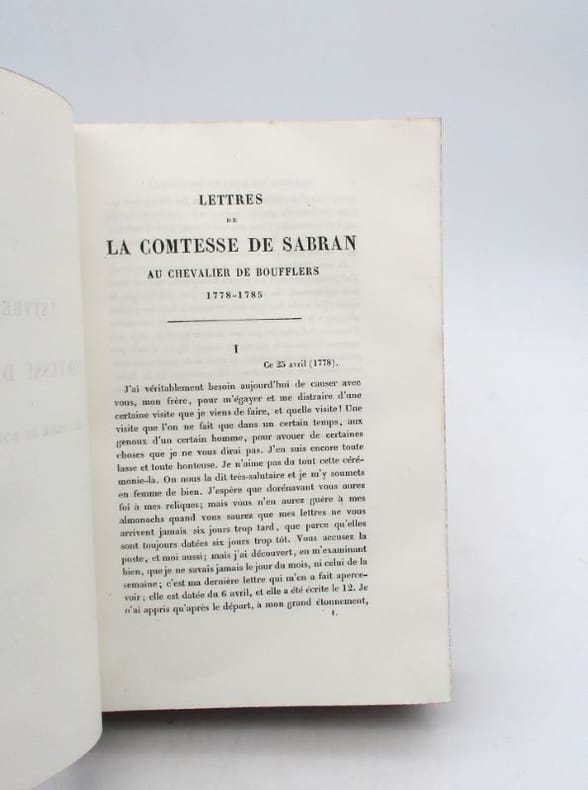 Deuxième édition publiée par E. de Magnieu et Henri Prat. Une déchirure en tête du dos, petites déchirures marginales avec légers manques sur les plats, premier plat partiellement et légèrement insolé, agréable état intérieur. Ouvrage illustré, en frontispice, d'un portrait de la comtesse de Sabran. - Photographies et détails sur www.Edition-Originale.com -
