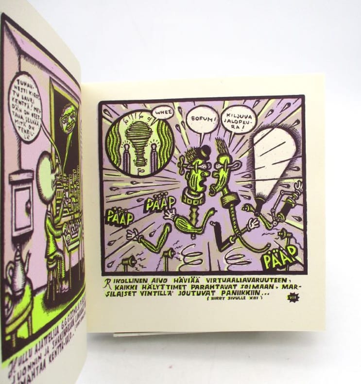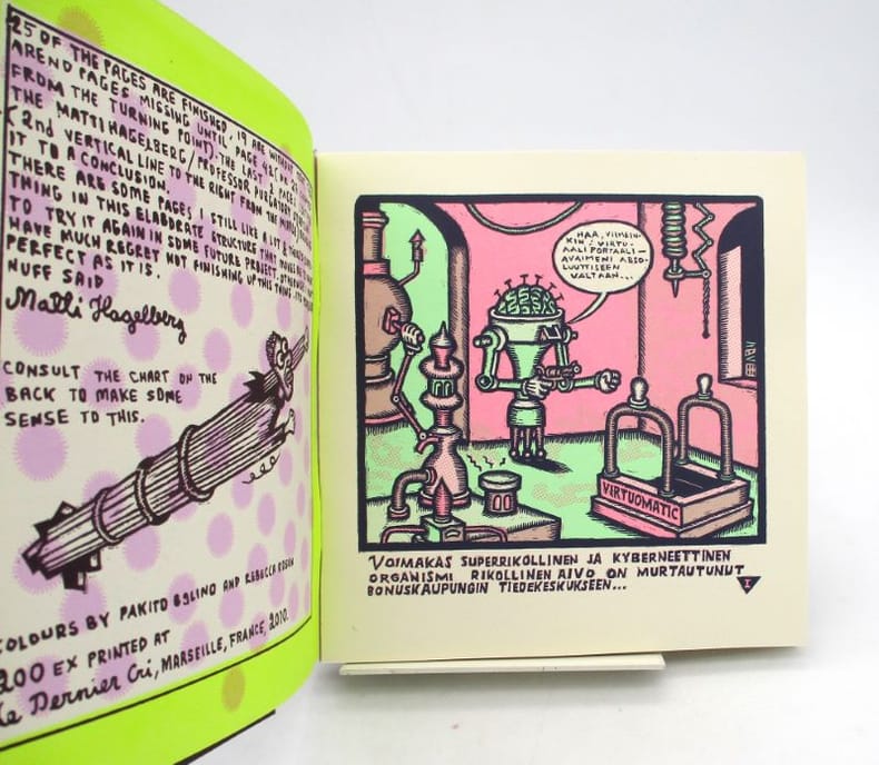 Roman graphique en finnois illustré en couleurs. Un des 200 exemplaires tirés, seul tirage annoncé. * Membre du SLAM et de la LILA / ILAB Member. La librairie est ouverte du lundi au vendredi de 14h à 19h. Merci de nous prévenir avant de passer,certains de nos livres étant entreposés dans une réserve.