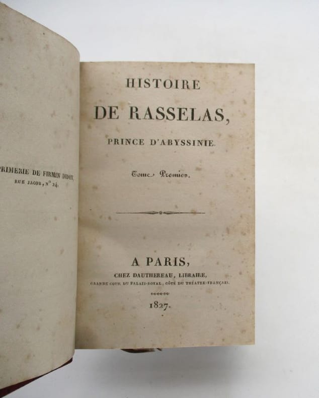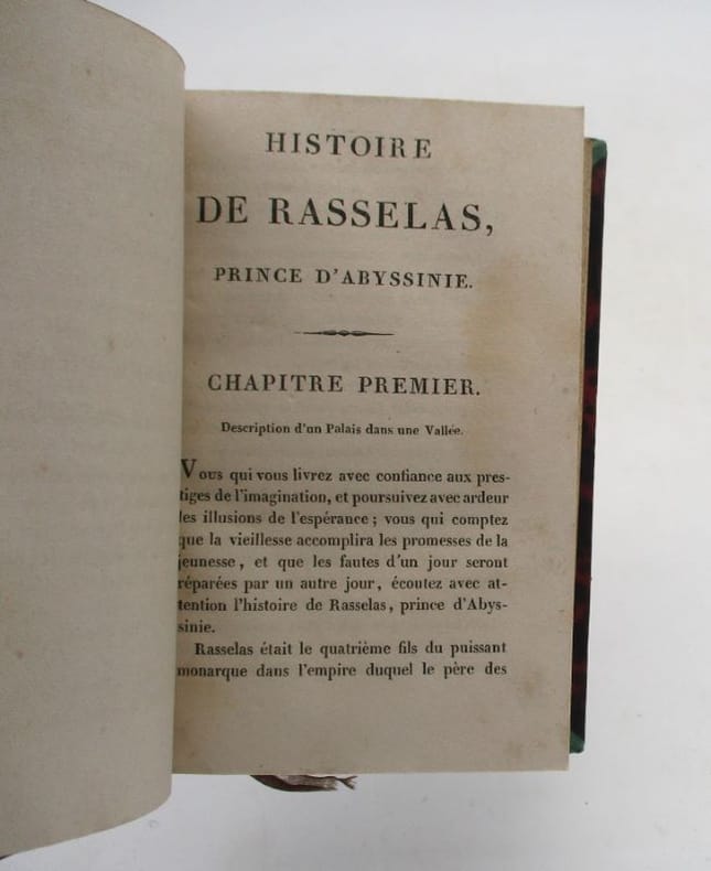 Ni les traductions de Mme Belot (1760), ou celle de Donnant, sous le titre : La Vallée heureuse, ou le Prince mécontent de son sort, par Johnson (1803), ou de Gosselin (1822), ni celle de Mme de Fresne en 1832, ne correspondent à la présente traduction, qui présente quelques maladresses. Il s'agit vraisemblablement de la mise au propre d'une traduction inédite, par une main anonyme. Le conte de Jonhson eut du succès dès sa parution et tout au long du 19e siècle, il est légitime de penser que plusieurs traductions anonymes aient circulé. Reliure frottée aux coins et coupes, coins émoussés, début de fente sur 3 cm à la charnière supérieure, manque à la coiffe supérieure. Exemplaire resté agréable. (Reu-Bur)