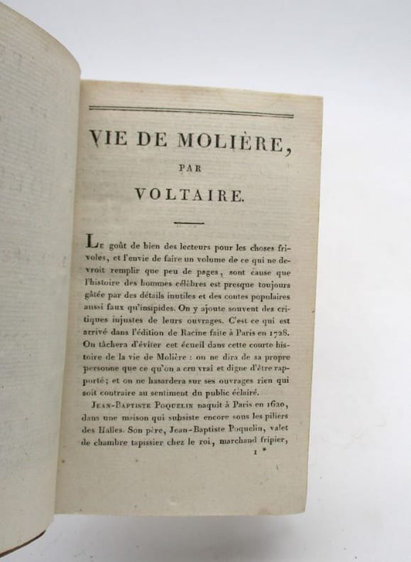 1799 Edition Didot 1799. Tomes 1, 2, 3, 5, 6, 7 et 8. 1799 Paris, Pierre Didot l'ainé et Firmin Didot, An VII (1799).Charmant ensemble , tres bien relié demi veau , dos lisse , pieces de titres et auteur rouge et verte tome 1 L' étourdi , ou les contre-temps , le défi amoureux, les précieuses ridicules , SganarelleTome II. Don Garcie de Navarre. L'École des maris. Les Fâcheux (avec le Prologue de P. Pellisson). L'Ecole des femmes. ; Tome III. La Critique de l'École des femmes. Remerciement au Roi. L'Impromptu de Versailles. La Princesse d'Élide. Le Mariage forcé. Don Juan.];Tome IV : l'amour medecin, le mysanthrope, médecin malgré lui , , Melioerte, Pastorale comique , Le Sicilien ou l'amour peintre Tome V. Le Tartuffe. Amphitryon. George Dandin.Tome VI. L'Avare. Monsieur de Pourceaugnac. Les Amants magnifiques. ;Tome VII. Le Bourgeois gentilhomme. Les Fourberies de Scapin. Psyché.Tome VIII. Les Femmes savantes. La Comtesse d'Escarbagnas. Le Malade imaginaire. La Gloire du Val-de-grâce. Magnifique dans cette reliure ....