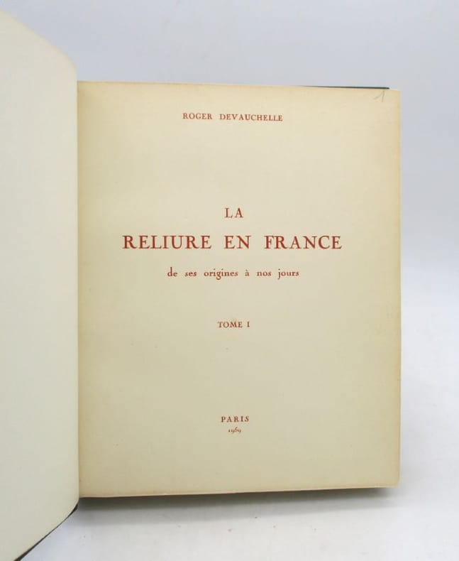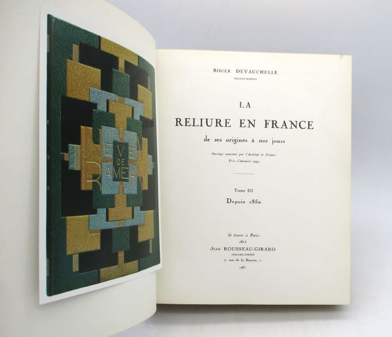 Paris Rousseau-Girard 1959-1961 3 volumes in-4, en feuilles, couvertures imprimées (emboîtages de l'éditeur).La plus importante monographie consacrée à la reliure française, illustrée de 261 planches hors texte en noir ou en couleurs et de très nombreux in-texte. Tirage unique limité à 900 exemplaires non numérotés. Les collections complètes sont très rares car les exemplaires du premier tome, souscrits hors de France par de nombreux amis de l'auteur, sont introuvables (41750 - DOC 417).