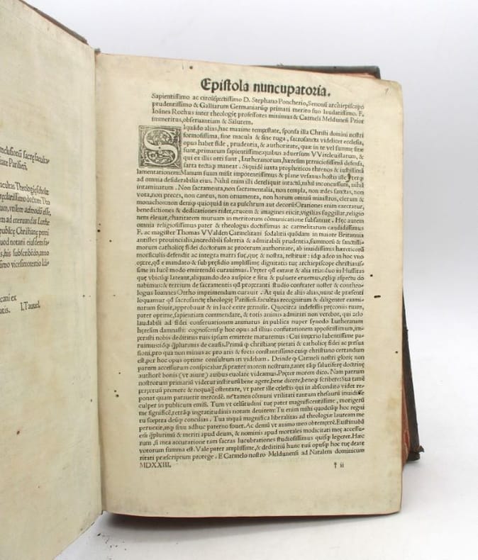 Édition originale du "De Sacramentalibus" de Thomas Walden ou Netter qui constitue le troisième volume des Sacramentalia qui parurent entre 1521 et 1532. Elle est ornée d'un titre gravé en noir et rouge avec au centre une belle marque de l'imprimeur ainsi que de lettrines à fond noir criblé. Le texte se répartit sur deux colonnes avec les titres en gothique et le reste du texte en romain. L'épître dédicatoire à Étienne Poncher (archevêque de Sens) est rédigé par Jean Roch. Walden, carmélite, théologien et diplomate anglais. Walden entreprend la composition de l'ouvrage en réponse aux opinions exprimées par John Wyclif et ses suiveurs les Lollards, des précurseurs de la Réforme anglaise qui souhaitent abolir l'autorité papale et rompre avec l'Église catholique. Cette publication connaît un certain succès et quelques rééditions au XVIe siècle. Ex-libris J.B. Roben, daté de 1813, ex-libris manuscrit Petri Lefaivre et Collegii [illisible] daté de 1775. Quelques annotations marginales d'une main ancienne. P. Renouard, Bibliographie des impressions et des uvres de Josse Badius Ascensius, Paris, 1908, III, p. 388. Rare sur le marché. * Membre du SLAM et de la LILA / ILAB Member. La librairie est ouverte du lundi au vendredi de 14h à 19h. Merci de nous prévenir avant de passer,certains de nos livres étant entreposés dans une réserve.