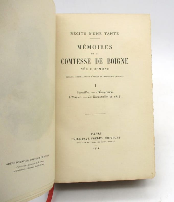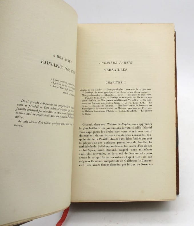 Nouvelle édition des souvenirs de cette célèbre salonnière et mémorialiste française. Un des 1000 exemplaires sur vergé teinté des papeteries de Corvol-l'Orgueilleux, seul tirage annoncé. Chaque volume comporte un portrait en frontispice (dans l'ordre des volumes) : le portrait de l'auteur, un portrait de sa mère Hélène Dillon, un portrait de son père René Eustache d'Osmond, un portrait de sa belle-soeur Marie-Aimée Destillères et un portrait de son frère Charles-Eustache-Gabriel d'Osmond. Bel exemplaire. * Membre du SLAM et de la LILA / ILAB Member. La librairie est ouverte du lundi au vendredi de 14h à 19h. Merci de nous prévenir avant de passer,certains de nos livres étant entreposés dans une réserve.