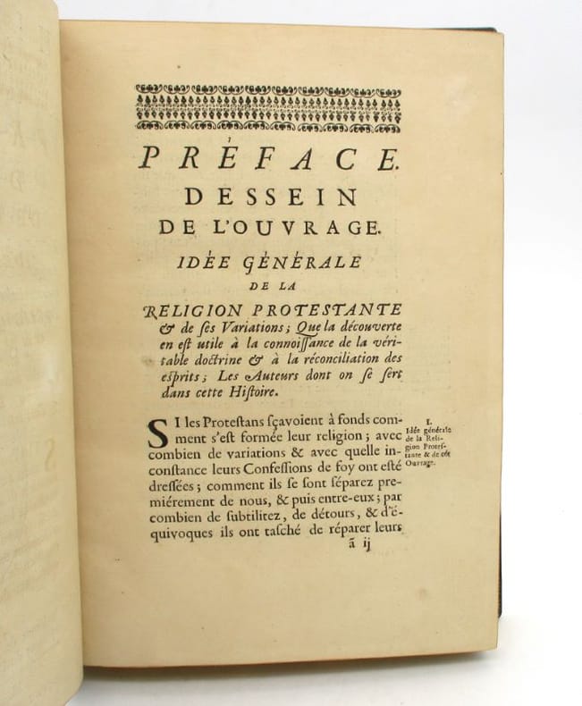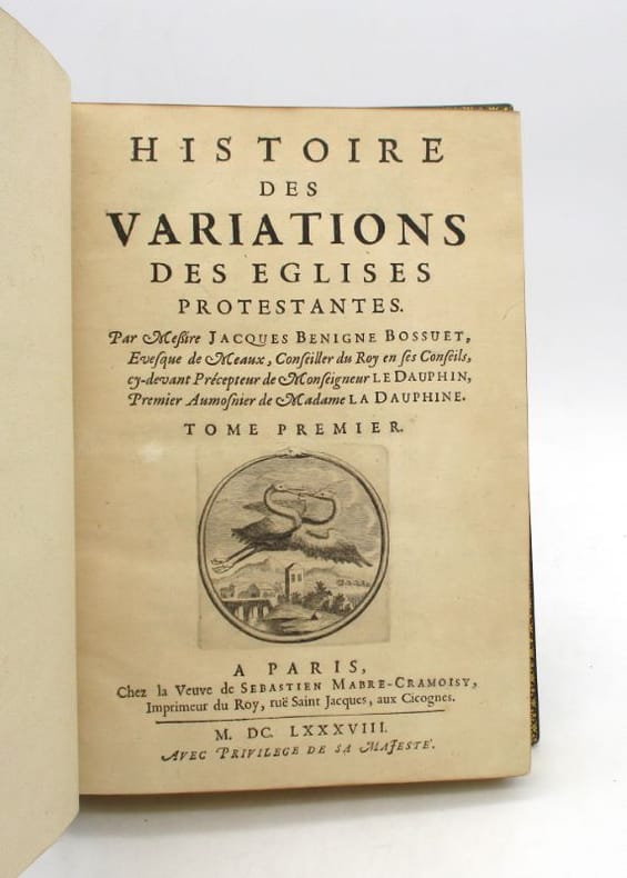 Edition originale ; complète des deux volumes la constituant. Ensemble - agréablement relié - agrémenté de larges tout autant que délicats ornements typographiques figuratifs gravés. Marque gravée de l'imprimeur aux deux cigognes répétée sur chacune des pages de titre. Bossuet et Cramoisy s'étant aperçus après l'impression de la présence de coquilles, tous deux s'employèrent alors à les corriger à la plume. On notera ainsi que le présent exemplaire est pourvu de quelques biffures. Cet ouvrage de controverse religieuse - qui demandait à la fois Ie concours du génie et des connaissances les plus profondes dans l'histoire, la religion et la politique, fut achevé en trois ans. Opposé au Protestantisme, Bossuet y expose là l'origine de la Réforme, tout en relatant l'histoire de ses diverses confessions. En outre, il combat ce qu'il considère comme des erreurs, posant ce principe : "La véritable simplicité de la doctrine chrétienne consiste essentiellement à toujours se déterminer, en ce qui regarde la foi, par ce fait certain : hier on croyait ainsi, donc aujourd'hui il faut croira encore de même; car la foi qui change n'est point une foi, elle n'est pas la parole de Dieu, qui est immuable''. Son ambition vise ici à ruiner la prétention des novateurs que de vouloir se rattacher aux premiers jours de la religion. Il s'attache ensuite à montrer que leurs dissidences, entraînant l'instabilité, ont pour effet infaillible de rendre toute doctrine incertaine, et de conduire à l'indifférence en matière de dogme, puis à la négation de tous les dogmes chrétiens. Le ministre Pierre Jurieu répondra à la controverse au travers de diverses lettres ouvertes. La riposte de Bossuet viendra par le livre Avertissements aux protestants sur les lettres du ministre Jurieu contre l'Histoire des variations auxquelles Jurieu répondra de nouveau par l'ouvrage Répliques aux lettres de Jurieu aux avertissements aux protestants sur les lettres du ministre Jurieu contre l'Histoire des variations. Cette polémique n'aura de cesse d'enfler et fera peu à peu perdre la raison à Bossuet. Son dernier ouvrage ''Tu verras, les variation de ta guele si je te croise, Jurieu !'' démontrait l'état d'obsession dans lequel il Bossuet avait sombré. Lequel ouvrage n'aura d'ailleurs jamais été édité. Quoiqu'il en soit, Bossuet déploya en son Histoire des variations des Eglises protestantes, une immense érudition doublé d'un talent supérieur comme dialecticien et comme écrivain. Ce qui fera dire à Villemain que l'ouvrage peut être regardé tel ''le chef-d'oeuvre de la méthode parfaite et de la parole précise et simple, dans l'orateur qui a le plus d'enthousiasme et de génie". Tchemerzine I, Bibliographie d'éditions originales et rares d'auteurs français, 859 - Brunet I, Manuel du libraire et de l'amateur de livres, 1135 - Fournier, Nouveau dictionnaire de bibliographie, p. 83 - Quérard I, La France littéraire, p. 429. Angles et coiffes de queue élimés. Légères tout autant que discrètes altérations superficielles affectant les plats. Rares rousseurs dans le texte. Quelques feuillets légèrement oxydés. Du reste, très belle condition. Peu courant.
