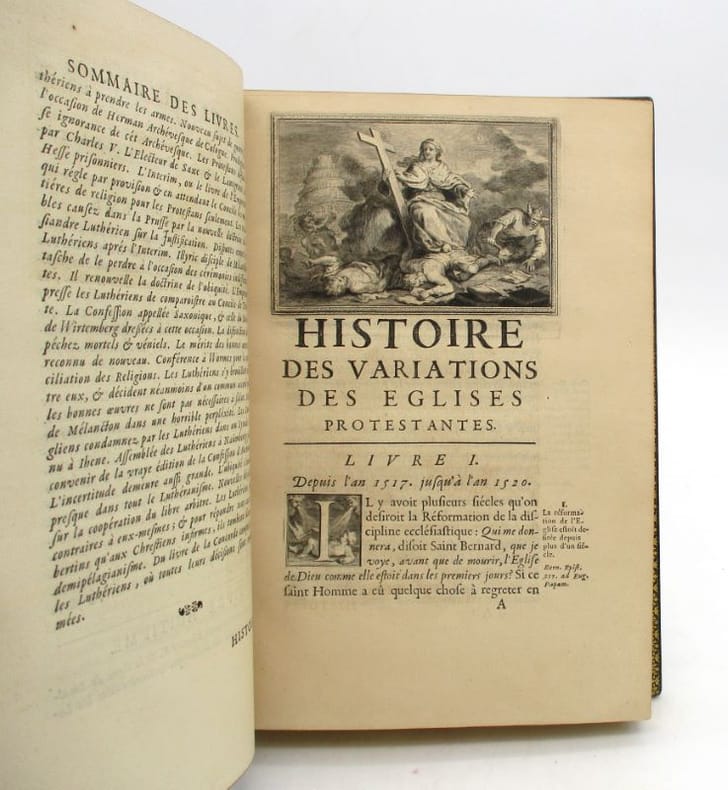 A Paris, Chez la Veuve de Sébastien Mabre Cramoisy et se vend à Liège, Chez J. F. Broncart - 1702 - 406 et 524 pages. Table et Sommaires. Glose.Reliure plein veau marbré de l'époque. Dos à nerfs orné et doré. Pièces de titre fauves. Roulettes dorée sur les coupes. Deux coiffes accidentées. Pas de rousseur. Bon état. Format in-12°(16x10).Jacques-Bénigne Bossuet, surnommé parfois "Aigle de Meaux ", né le 27 septembre 1627 à Dijon et décédé le 12 avril 1704 à Paris, est un homme d'Église, évêque de Meaux, prédicateur et écrivain français. Certains voient en lui "le plus grand [orateur] peut-être que le monde ait connu".L'Histoire des variations des Églises protestantes est un ouvrage anti-protestant, commencé en 1682 et publié en 1688 à Paris. Il comprend quinze livres. En raison de la réponse du pasteur Pierre Jurieu, Bossuet a écrit une suite : les Avertissements aux protestants sur les lettres du ministre Jurieu contre l'Histoire des variations, parus en 1689-1691.