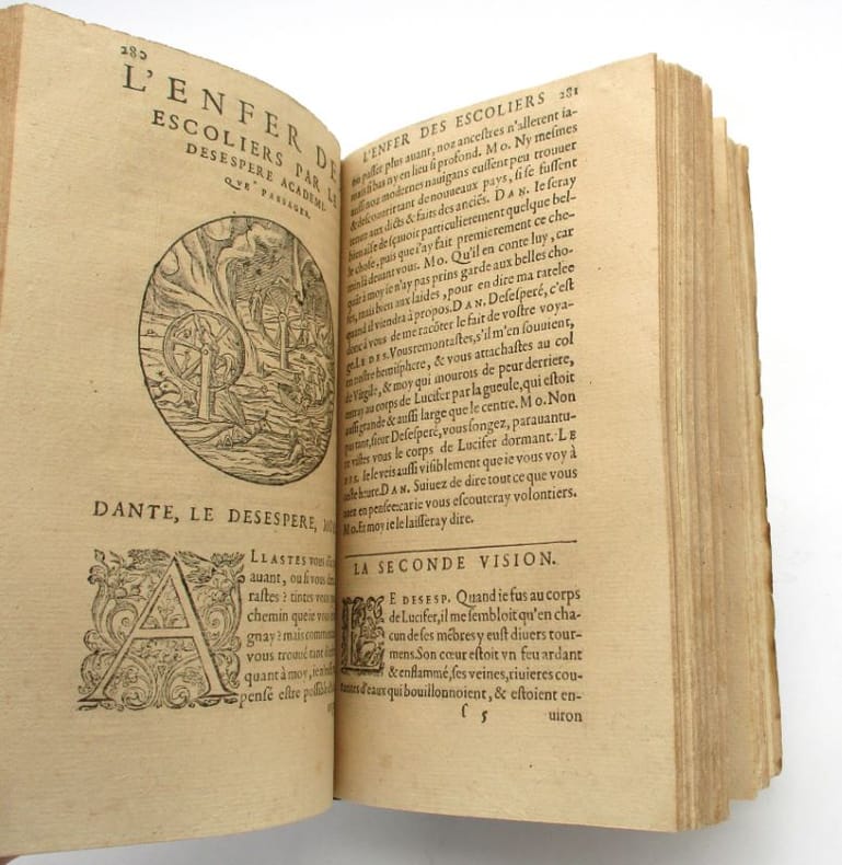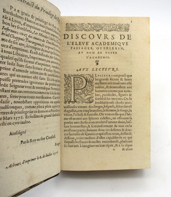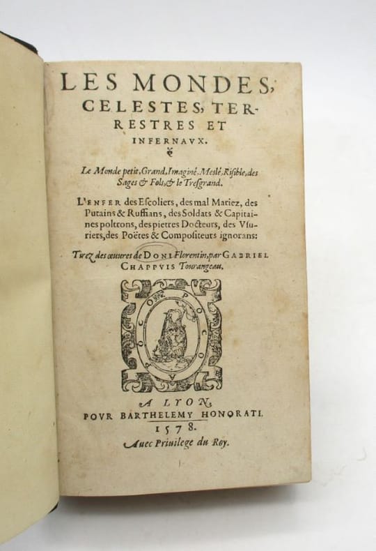 Édition princeps de la traduction française de Gabriel Chappuis. Elle est illustrée de 14 gravures sur bois représentant les différents mondes décrits par l'auteur, d'une petite marque de Barthélémy Honorat au titre et d'une plus grande au verso du dernier feuillet. Brunet, II, 125; Caillet, I, p. 483, 3198 : "livre rare et singulier [...] Les gravures sur bois, en forme de médaillons sont très intéressantes." * Membre du SLAM et de la LILA / ILAB Member. La librairie est ouverte du lundi au vendredi de 14h à 19h. Merci de nous prévenir avant de passer,certains de nos livres étant entreposés dans une réserve.