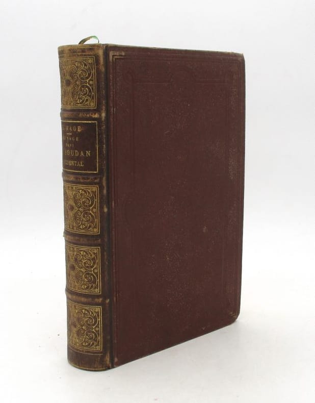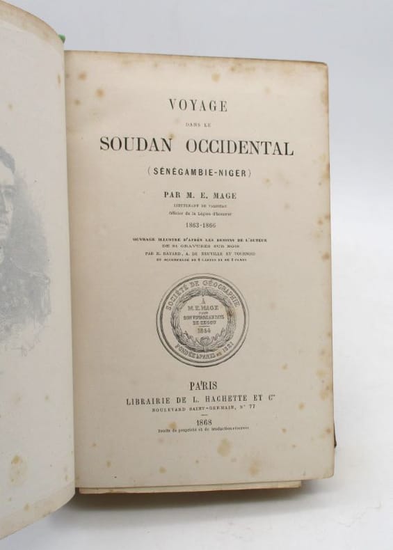 3 ff.n.ch., pp. VII-X, un f.n.ch., 693 pp., nombreuses figures dans le texte et 8 cartes et plans hors texte (dont 5 à double page et 2 en dépliant).Gay 2783. Numa Broc 214-215. Édition originale."La portée du voyage de Mage est considérable. Sur le plan politique et commercial, il a ouvert le Soudan [bassin du Niger] à la France. Il a fait connaître à l'Europe l'Empire d'El-Hadj Omar, dont les états islamisés interpénètrent étroitement ceux des Bambara et des Mandingues fétichistes. Il a montré que le principal ennemi des Européens en Afrique noire est l'Islam. Quelle riche moisson géographique aussi, dans des pays qui n'avaient pratiquement pas été vus depuis Mungo Park et René Caillé ! Les coordonnées des principales villes ont été corrigées ; les cours des fleuves fixés avec plus d'exactitude ; le Niger supérieur et le Macina entre Ségou et Tombouctou cartographiés pour la première fois" [Numa Broc]