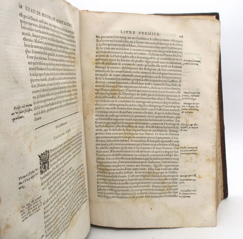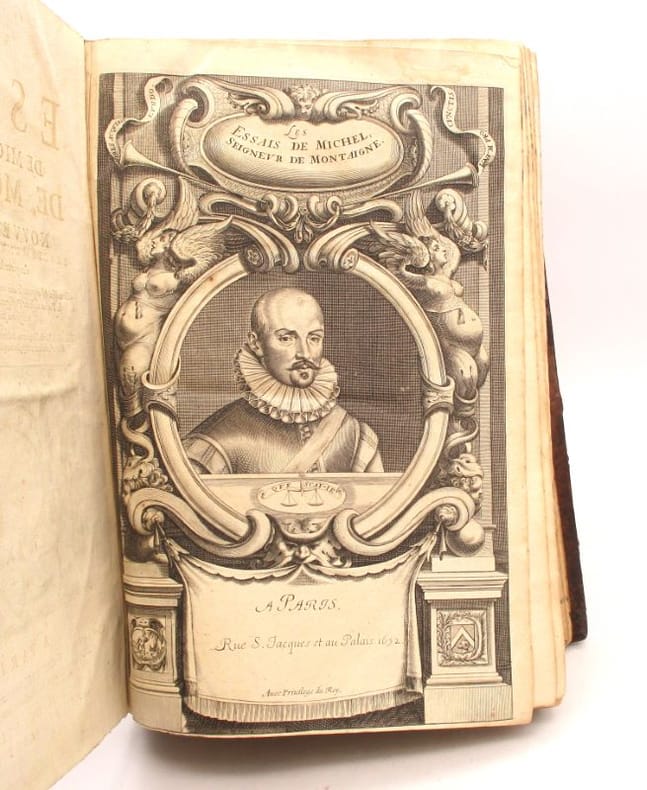 Nouvelle édition des Essais imprimée par Henri Estienne, "qui le premier a placé aux marges et en regard des passages cités, les traductions de ces passages" (Brunet). Elle est ornée d'un beau portrait de l'auteur en frontispice, d'une vignette au titre gravée par Daret, de bandeaux aux armes de France et de Navarre ainsi que des lettrines et culs-de-lampe. Quelques annotations marginales. Brunet, III, 434. * Membre du SLAM et de la LILA / ILAB Member. La librairie est ouverte du lundi au vendredi de 14h à 19h. Merci de nous prévenir avant de passer,certains de nos livres étant entreposés dans une réserve.