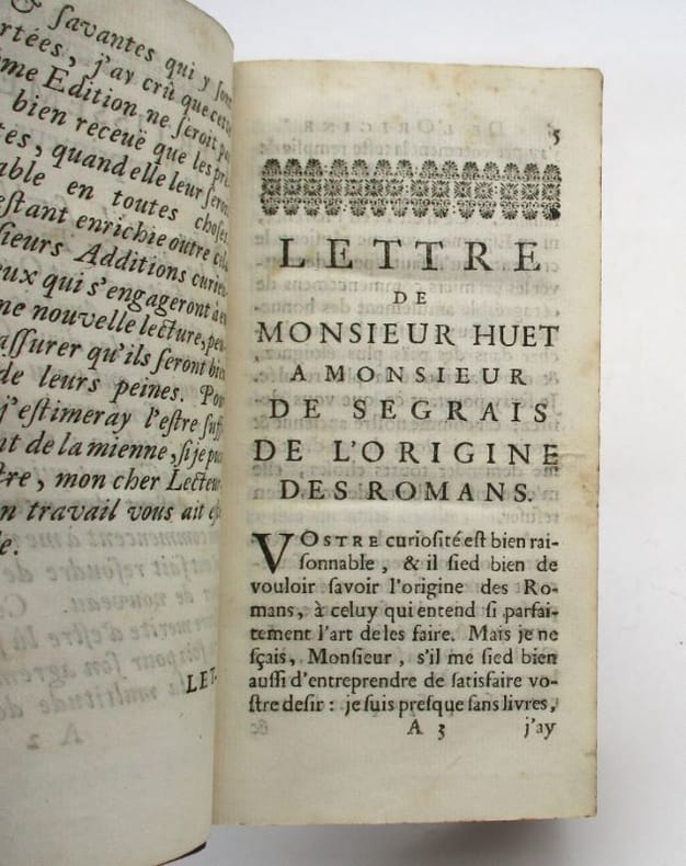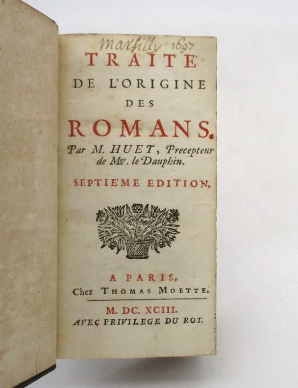 Septième édition (en réalité, la quatrième) de cette lettre-essai sur l'histoire des romans. Elle est publiée pour la première fois en 1670 en tant que préface à Zaïde de madame de Lafayette. Ex-libris manuscrits J. L'Ancillon et Marsilly (au titre, daté de 1697). * Membre du SLAM et de la LILA / ILAB Member. La librairie est ouverte du lundi au vendredi de 14h à 19h. Merci de nous prévenir avant de passer,certains de nos livres étant entreposés dans une réserve.