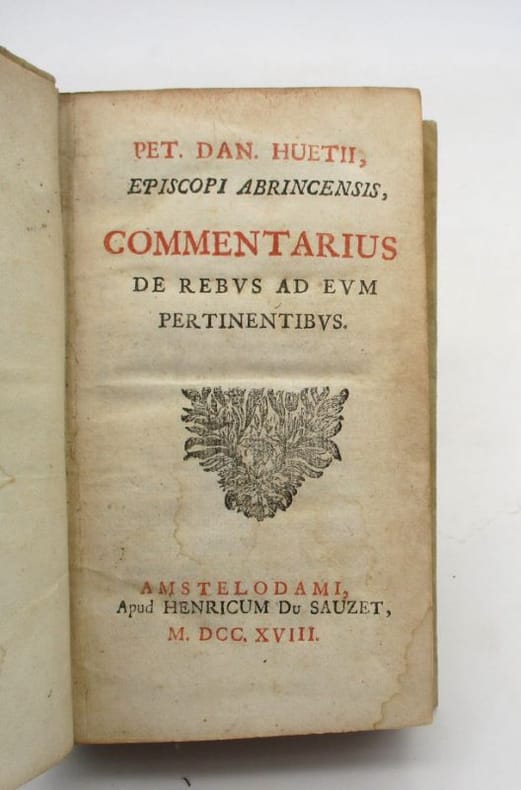 Édition originale de cette autobiographie comprenant, dans la préface, une bibliographie des oeuvres d'Huet. Ex-libris gaufré de de Germain Malbreil. Annotations d'une main ancienne au dos de la première garde. * Membre du SLAM et de la LILA / ILAB Member. La librairie est ouverte du lundi au vendredi de 14h à 19h. Merci de nous prévenir avant de passer,certains de nos livres étant entreposés dans une réserve.