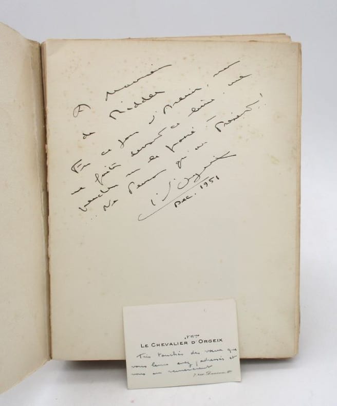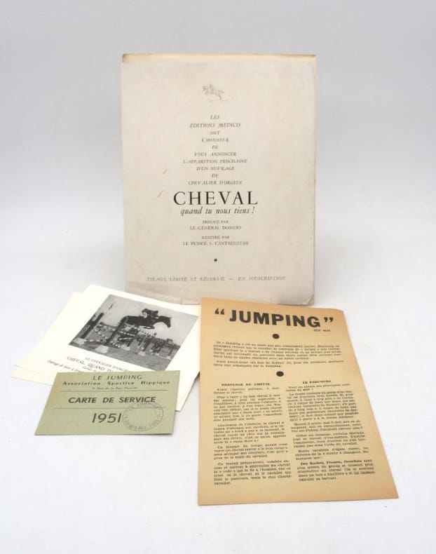Édition originale de ce traité consacré au saut d'obstacle. Il est illustré par le prince S. Cantacuzène. Un des 2592 exemplaires tirés sur vélin Johannot d'Annonay, celui-ci comporte un envoi autographe signé de l'auteur ainsi que sa carte de visite avec quelques mots de sa main. On joint des prospectus liés à l'ouvrage. * Membre du SLAM et de la LILA / ILAB Member. La librairie est ouverte du lundi au vendredi de 14h à 19h. Merci de nous prévenir avant de passer,certains de nos livres étant entreposés dans une réserve.