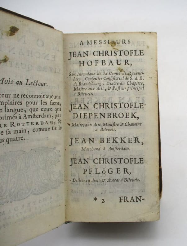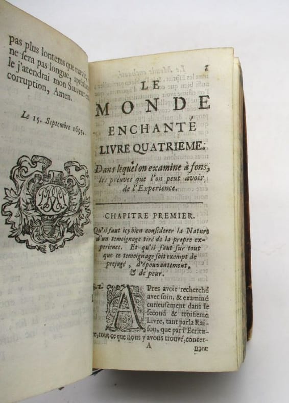 Édition originale française du quatrième livre de ce traité. Elle est ornée de 6 planches gravées dont 5 représentant des personnages avec des baguettes divinatoires. L'ouvrage fut condamné par le Synode et valut à son auteur de nombreuses attaques et persécutions. Pourtant il connut de nombreuses rééditions et traductions dans les années qui suivirent sa parution. L'exemplaire est signé par son auteur à la fin de l'épître dédicatoire comme chaque exemplaire se doit de l'être. Caillet, I, 915 : "Édition peu commune, la seule reconnue par l'auteur. Très important au point de vue historique et précieux pour l'état de la sorcellerie à cette époque". Ex-libris héraldique de Barthélémy Saphoux, ex-bibliotheca Facultatis Theologia Lugdunensis, ex-libris gaufré Germain Malbreil, tampons ex-libris de la Faculté de théologie de Lyon. * Membre du SLAM et de la LILA / ILAB Member. La librairie est ouverte du lundi au vendredi de 14h à 19h. Merci de nous prévenir avant de passer,certains de nos livres étant entreposés dans une réserve.