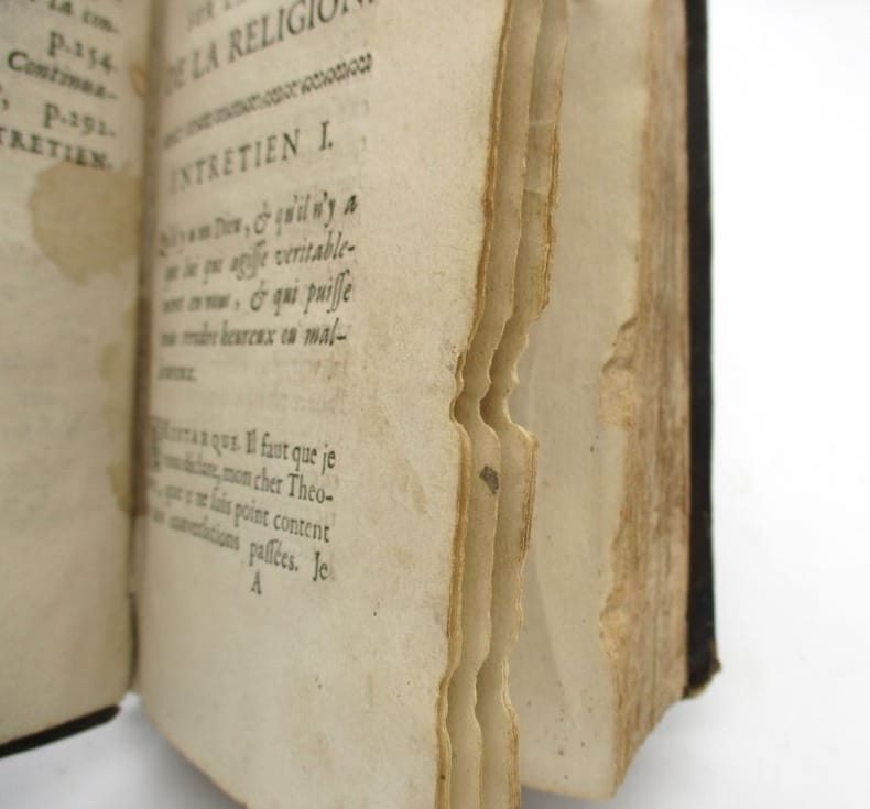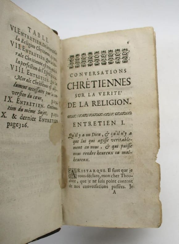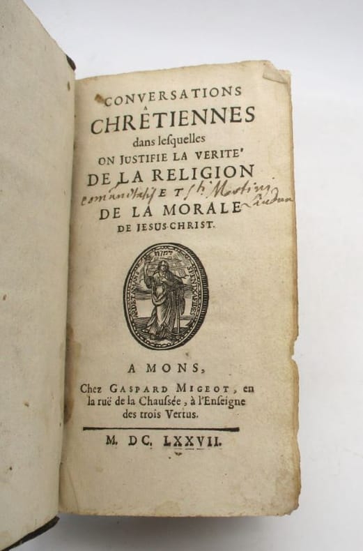 Édition originale de ce traité rédigé sous formes de dialogues philosophiques. Ex-libris manuscrit de la communauté de St Martin de Laudun au titre, ex-libris manuscrit de Marianne Vigneron Doigney, daté de 1715. * Membre du SLAM et de la LILA / ILAB Member. La librairie est ouverte du lundi au vendredi de 14h à 19h. Merci de nous prévenir avant de passer,certains de nos livres étant entreposés dans une réserve.