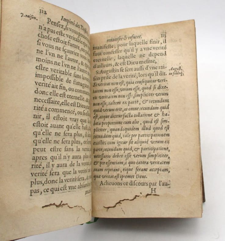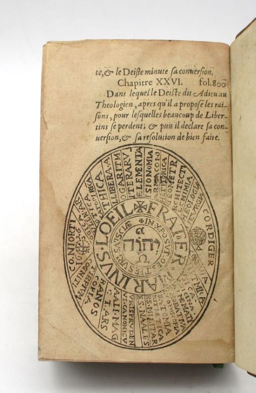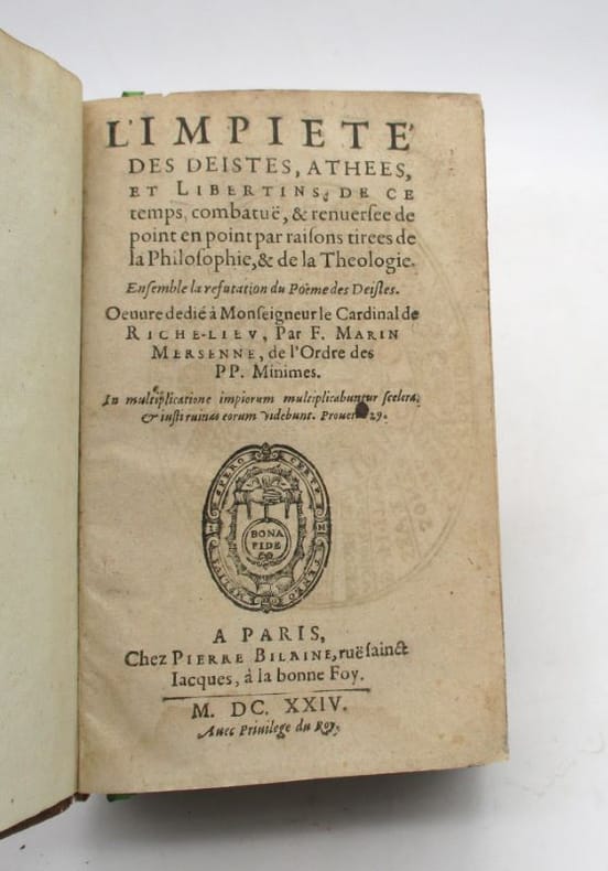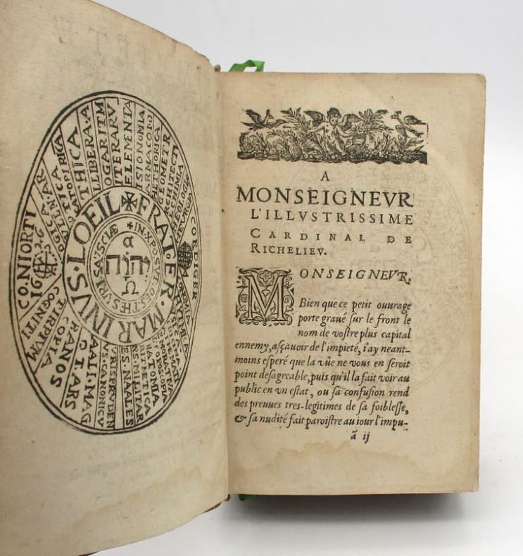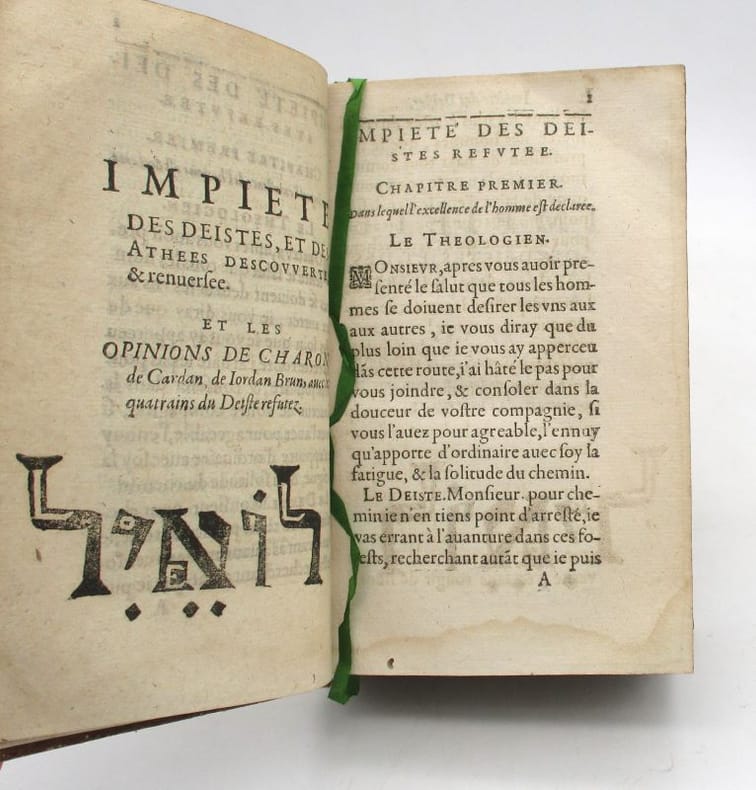Édition originale de la première partie de ce traité visant à réfuter les thèses de Pierre Charron, de Cardan, de G. Bruno et les Quatrains du déiste, souvent attribué à Théophile de Viau. Tampon ex-libris du frère Marin L'Oeil, daté de 1626 au dos du titre, en fin du texte et de la table des matières et un second du même, différent, apparaissant plusieurs fois dans le corps de texte. * Membre du SLAM et de la LILA / ILAB Member. La librairie est ouverte du lundi au vendredi de 14h à 19h. Merci de nous prévenir avant de passer,certains de nos livres étant entreposés dans une réserve.