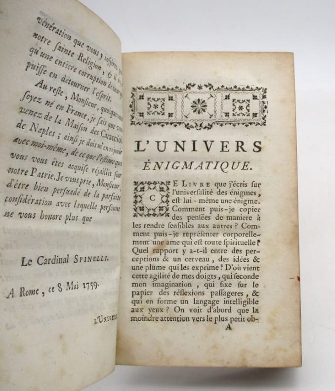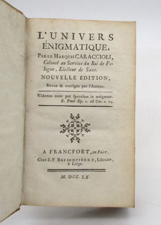 First edition of this rare work of the Enlightenment.Marquis Louis-Antoine Caraccioli ( 1719 - 1803) was a French writer, poet, historian, and biographer long time considered an ""enemy of Philosophy"" because of his extensive apologetic production. In his ""L'Univers Enigmatique"" he illuminates the mysteries of Christian faith and tries to build the foundation of modern Christianity in accordance with the Enlightenment. He was a strong opponent to deism, which is reflected in his attempt to combine Christianity with the spirit of the Enlightenment.