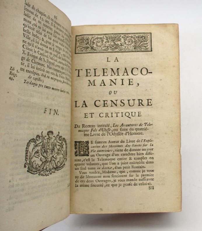 L'une des deux éditions parues à la date de l'originale. Celle-ci ne comporte pas derratum après l'avis au lecteur. La Télémaquomanie est une très violente satire des Aventures de Télémaque de Fénelon. L'abbé Faydit avait la manie de la contradiction et de la critique démesurée... On l'appelait le « fou érudit ». Sa critique de l'ouvrage de Fénelon, quoique parfaitement injuste, ne manque pas de talent. Quérard III, 82 ; Cioranescu, 28897; Conlon, 10054.