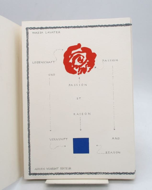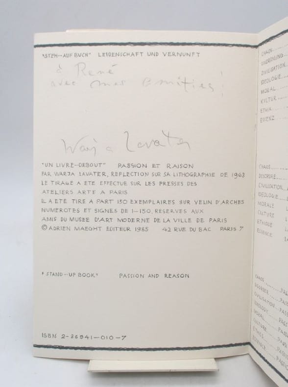 Textes en allemand, français et anglais. Beau leporello illustré de neuf lithographies en rouge, bleu set gris ur le thème de la relation passion / raison : Chaos : la passion sans la raison, désorde : la passion dérangée par la raison, civilisation : la pasison controlée par la raison, idéologie : la passion séduite par la raison, morale : la passion structurée par la raison, culture : la passion animée par la raison, éthique : la passion et la raison en harmonie, essence : la passion et la raison confondues.