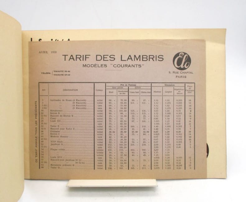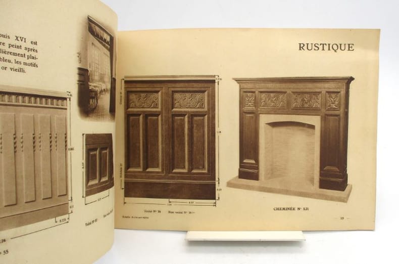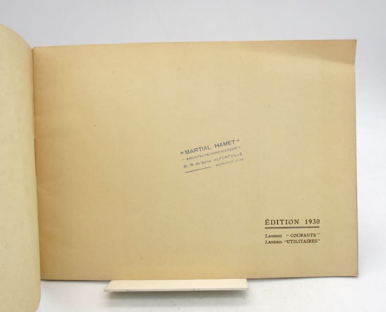 Joli catalogue de boiseries illustré en héliogravure bistre. Complet de la liste des tarifs d'avril 1930. Tampon Martial Hamet, architecte à Alfortville. * Membre du SLAM et de la LILA / ILAB Member. La librairie est ouverte du lundi au vendredi de 14h à 19h. Merci de nous prévenir avant de passer,certains de nos livres étant entreposés dans une réserve.