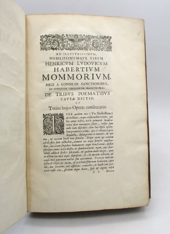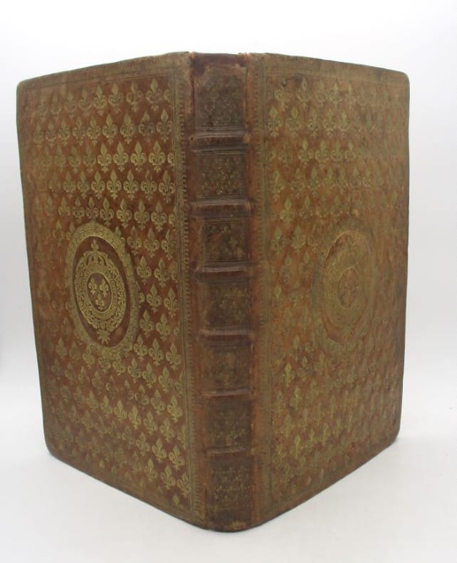 Fixae Andegavorum, ex officina Gervasii Laboe, [La Flèche, Gervais Laboê], 1661. In-4, [24]-483-[1] pp., basane mouchetée havane, frise dorée en encadrement sur les plats ornés d'un semé de fleurs de lys dorées et les armes de France dorées au centre, dos à nerfs orné de filets et fleurs de lys dorés, tranches dorées (reliure restaurée, petites épidermures, restauration d'un coin du titre et d'une marge au f. F3, galeries de ver sans atteinte, quelques taches et rousseurs éparses).