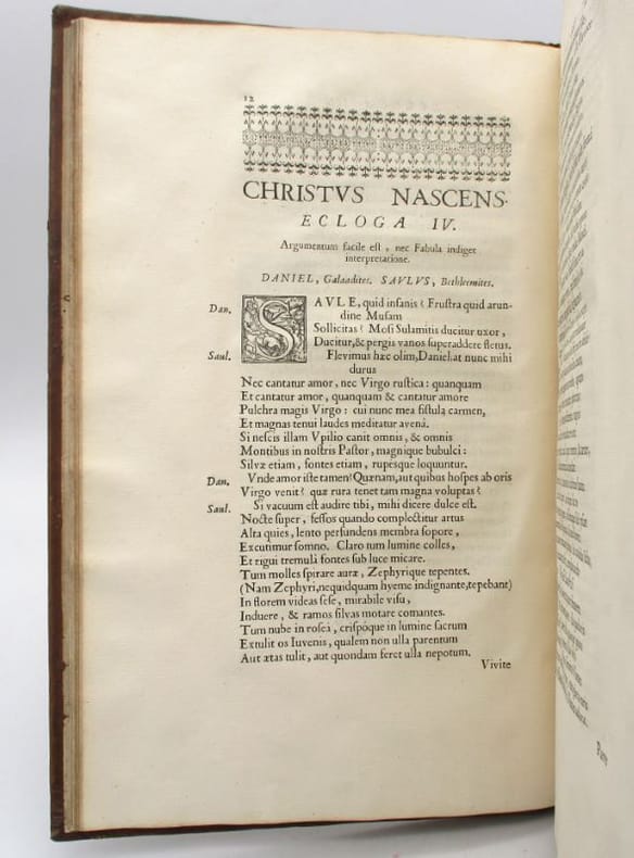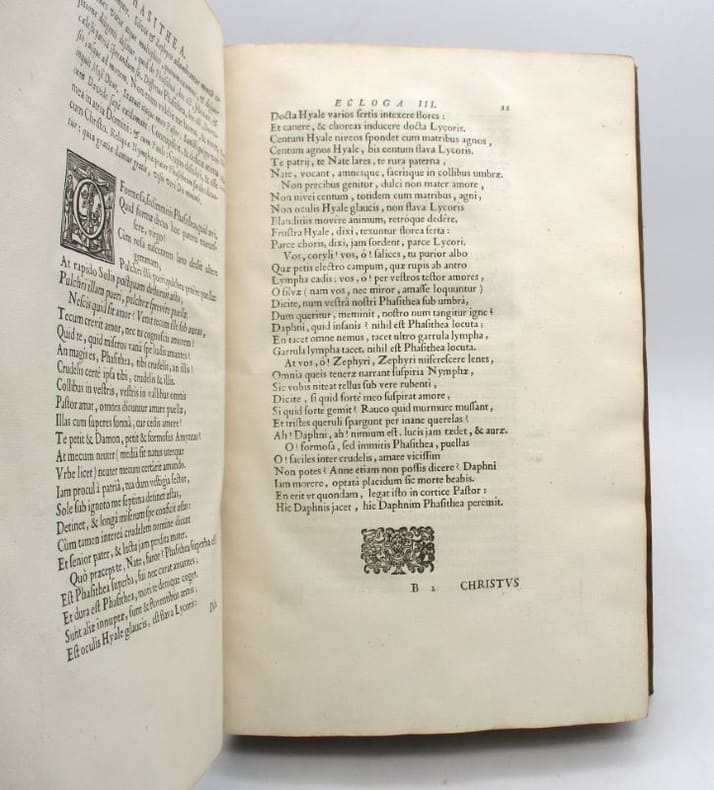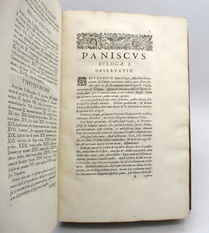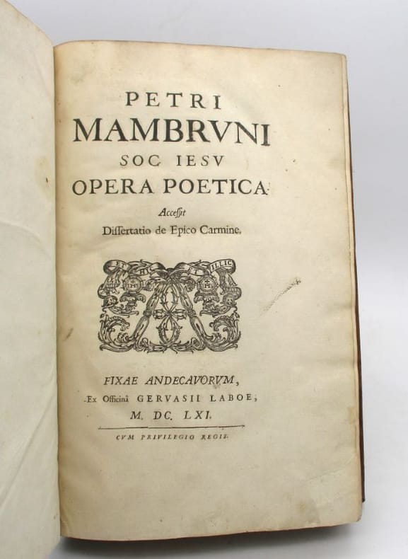 Très rare édition réunissant les oeuvres poétiques en latin du père jésuite Pierre Mambrun. Elle est composée des Églogues dont le dernier Daphnis comprend sa version grecque, le traité De Cultura Animi, le poème épique en douze livres Constantin, ou l'idolâtrie vaincue et enfin le fameux Traité de la poésie épique. Bien qu'on trouve quelques exemplaires dans des institutions, cet ouvrage reste extrêmement rare sur le marché. Belle reliure aux armes de France (sans doute celles de Louis XIV) et à la fleur de lys. À rapprocher du O.H.R. 2494 n°10 (115 x 100 mm); Backer, I, 478. * Membre du SLAM et de la LILA / ILAB Member. La librairie est ouverte du lundi au vendredi de 14h à 19h. Merci de nous prévenir avant de passer,certains de nos livres étant entreposés dans une réserve.