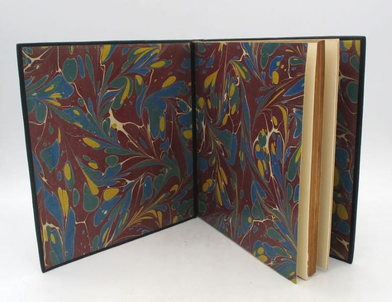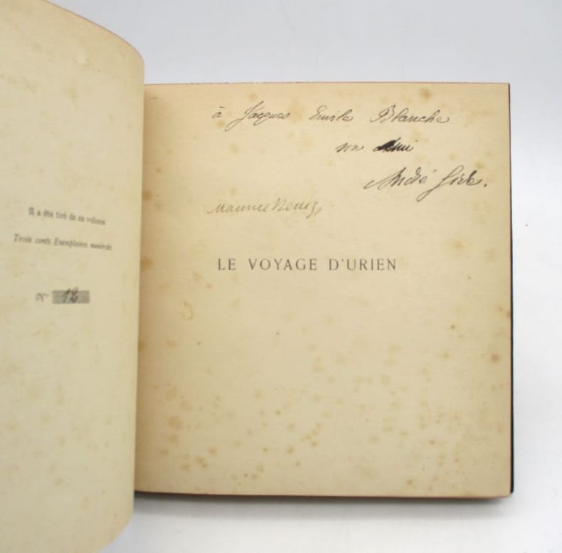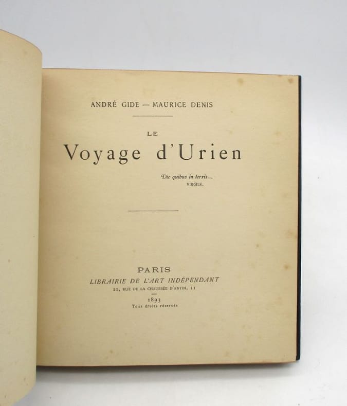 Paris, Editions Emile Paul Frères / Collection " Sous le Masque de la Folie " n° 5 de 1919. In-12 relié de 110 pages au format 19,5 x 13 cm. Reliure demi chagrin avec plats et pages de garde den papier marbré. Dos rond à 2 nerfs avec titre et fleurons dorés. Dos, mors, bords des plats et tranches frotttés. Couvertures conservées. Pièce de titre en couverture. Intérieur resté frais. Le Voyage d'Urien est un récit d'André Gide publié la première fois en mai 1893 par la Librairie de l'Art indépendant, illustré par des lithographies de Maurice Denis. Le livre raconte un voyage imaginaire et une quête improbable, effectué par Urien et ses compagnons qui errent de la mer des Sargasses à la mer glaciale. Profondément marquée par le symbolisme, ce texte peut être rattaché au domaine du " Fantastique ". Un des 1500 exemplaires numérotés sur papier de fil de Sainte-Mary-Cray ( n° 621, après 9 sur Chine, 27 sur Japon et 81 sur papier Américain de couleur goudron. Bel état général pour cette édition peu commune.