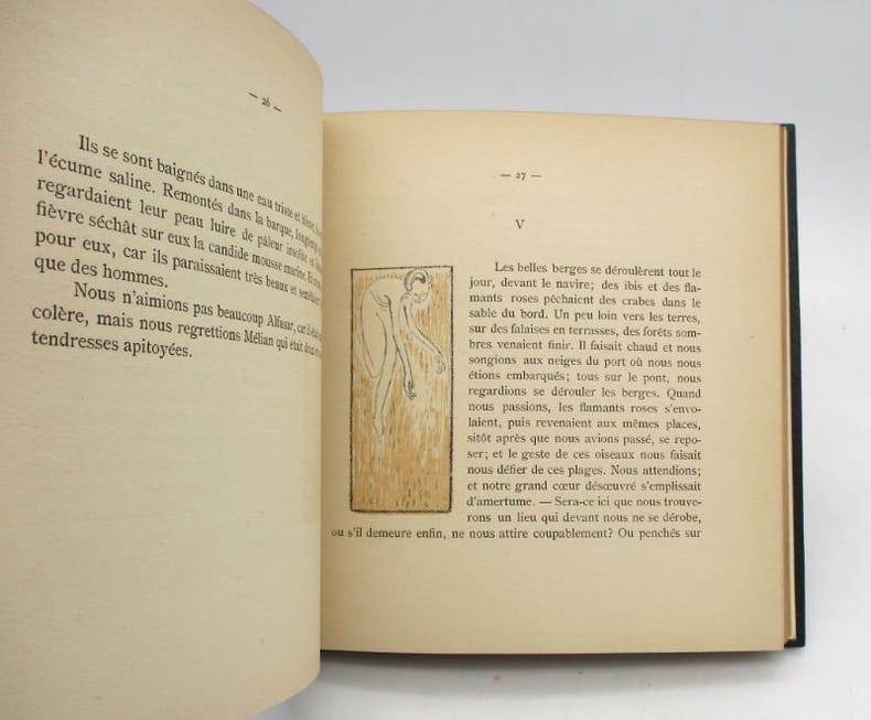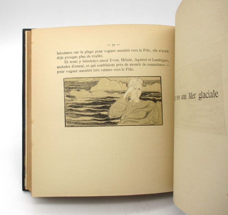 Paris, Librairie de l'Art indépendant, 1893. In-4° carré, broché. Edition originale. Tiré à 305 exemplaires. Un des 300 exemplaires sur vergé de Hollande. Ce voyage du Rien est une odyssée ironique, écrite «en réaction contre l'école naturaliste». Quelques jeunes gens en quête de «glorieuses destinées» s'embarquent pour un périple allégorique qui débouche dans les déserts glacés de la stérilité. 31 lithographies originales du peintre Maurice Denis. Si Le Voyage d'Urien occupe une place éminente dans l'histoire du Livre du peintre, on le doit au Nabis qui est parvenu à se libérer de toute servitude descriptive pour mieux investir le texte en créateur. Les lithographies sont tirées en deux tons, sur fond tantôt ocre, tantôt vert pâle. Elles sont quasiment les seules que Maurice Denis ait produites. Il fut, semble-t-il, peu attiré par la pratique de la gravure originale dans le livre. La mise en page dénote un grand raffinement dans les espaces, les initiales et les images. Références: Chapon, le peintre et le livre, 1870-1970, pp. 38-41. Peyré, Peinture et poésie. Le dialogue par le livre, 1874-2000, n°4 et pp. 105-106. The Artist and the Book, 1860-1970, Boston, n°76.