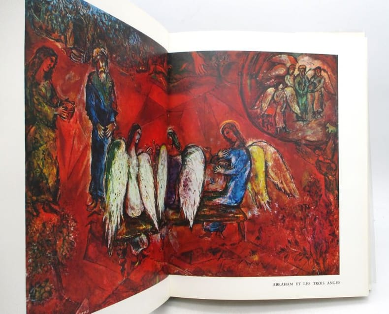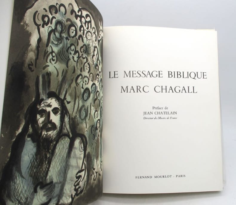 L'exemplaire s'agrémente de la reproduction et de la description en noir et couleurs des peintures, gouaches, esquisses préparatoires, gravures, lithographies, céramique, sculptures, tapisserie, mosaïque et vitraux de la donation Marc et Valentina Chagall. ''Le Message biblique a été donné à l'Etat pour permettre la création à Nice d'un ensemble culturel qui groupera en dehors des salles réservés à l'oeuvre, une galerie d'expositions temporaires. Les thèmes et les personnages bibliques sont des sources presque permanentes de l'imagination de l'artiste et les figures, les symboles et les couleurs du message se retrouvent dans d'autres oeuvres. Mais s'il est caractéristique de l'art de Chagall, le Message biblique y prend une importance spéciale parce qu'il en est une part plus pure, plus rigiureusement sincère, et partant plus émouvante''. Légères altérations affectant les coupes. Du reste, très belle condition.