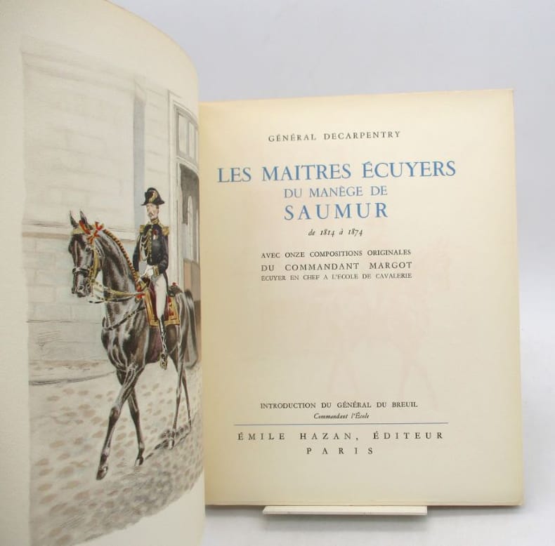 Introduction du général DUBREUIL. In 4 broché, couverture rempliée, faux-titre, justificatif de tirage, frontispice en couleurs, titre, 104 pages, 1 page de table des planches hors-texte, 11 compositions originales en couleurs hors-texte (dont le frontispice) du commandant MARGOT écuyer en chef à l’école de cavalerie. Illustrations en noir dans le texte. Emile HAZAN éditeur, Paris 15 janvier 1954. Illustrations reproduites par DUVAL, coloriées par BETHELOT. Exemplaire n° 1041 sur pur chiffon de LANA. Très bon état.